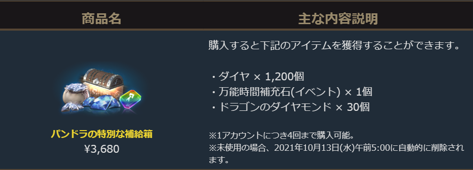 2021年9月29日より販売を開始しました「パンドラの特別な補給箱」のご案内を申し上げます。