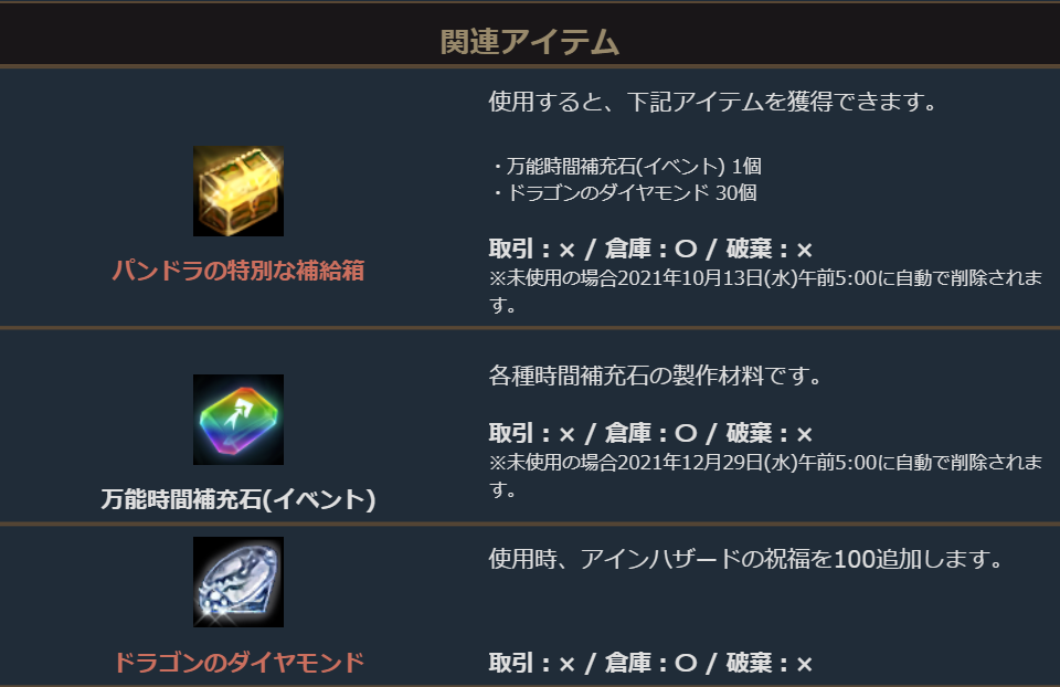 ※一部アイテムは未使用の場合、一定期間が経過すると自動で削除されます。詳しくは各アイテムの詳細をご確認ください。
