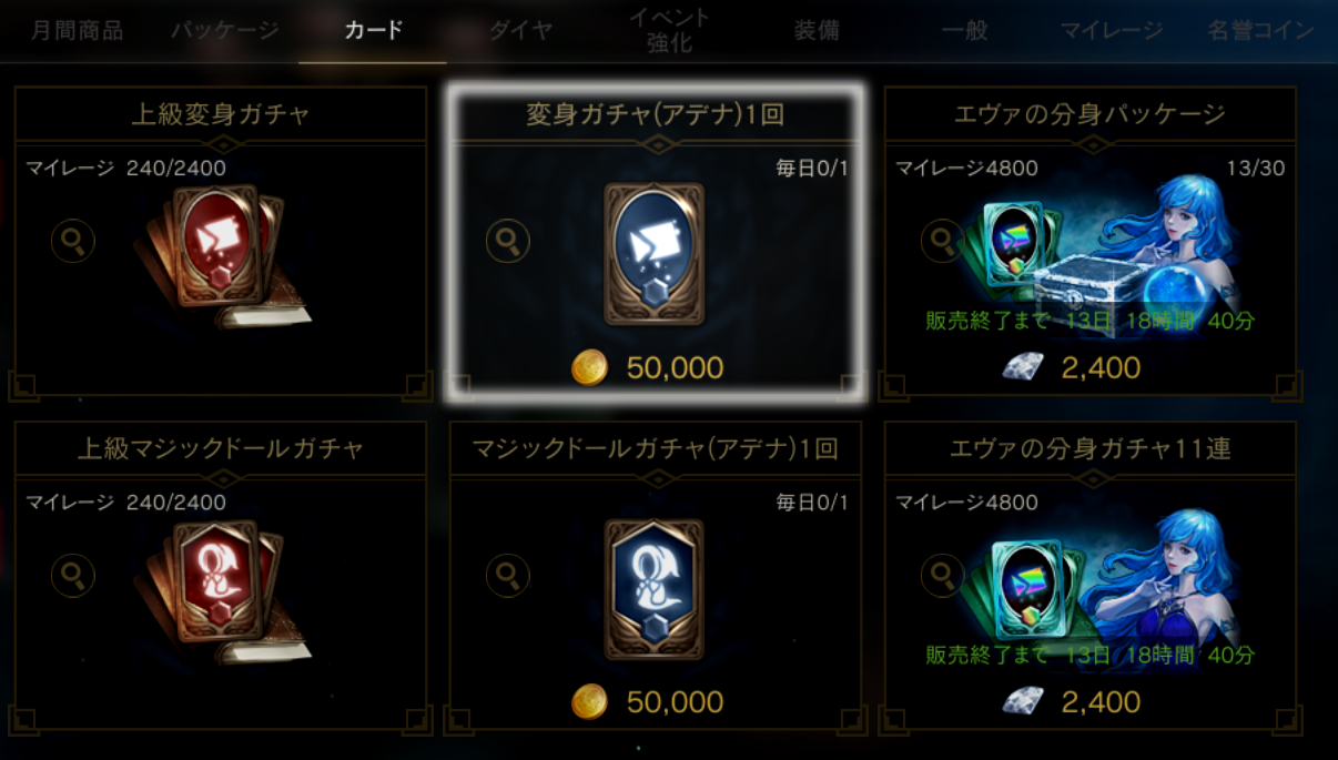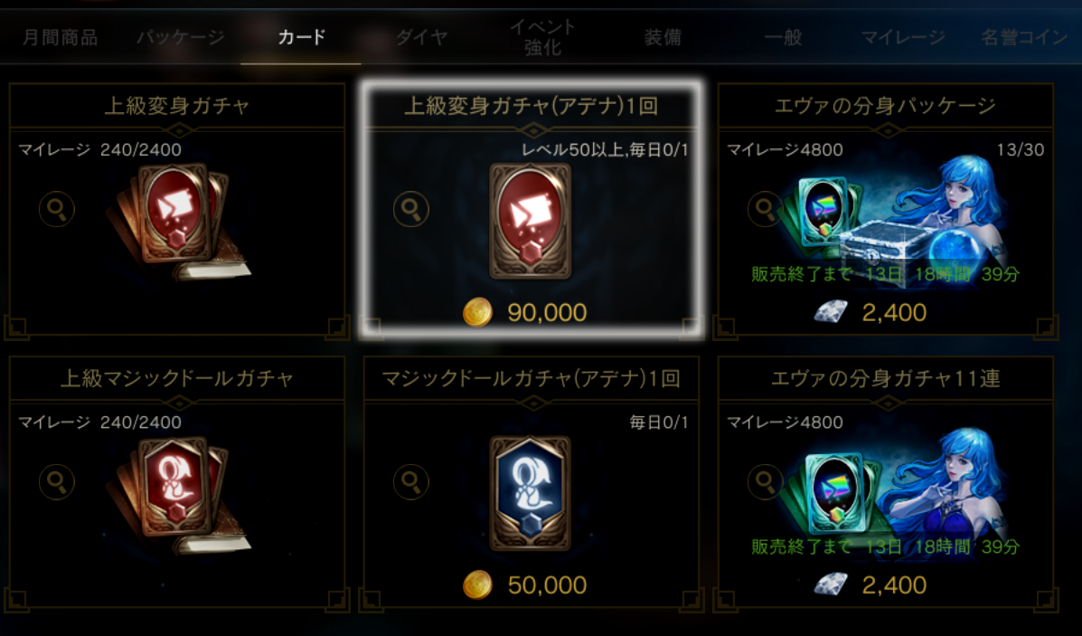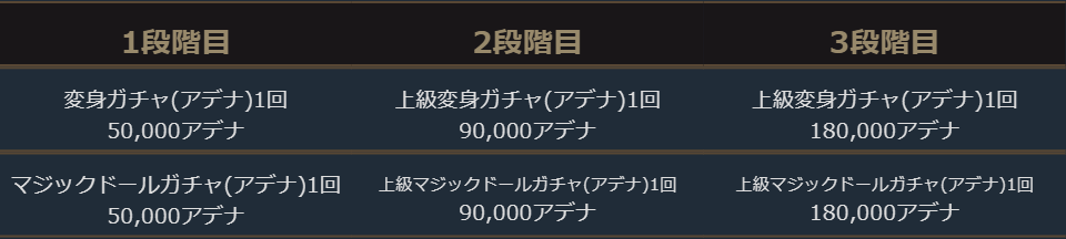 アデナによる変身/マジックドールガチャをステップアップ方式に変更しました。