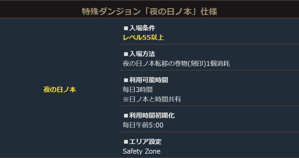 「夜の日ノ本」はレベル55以上のキャラクターが入場できる特殊ダンジョンです。