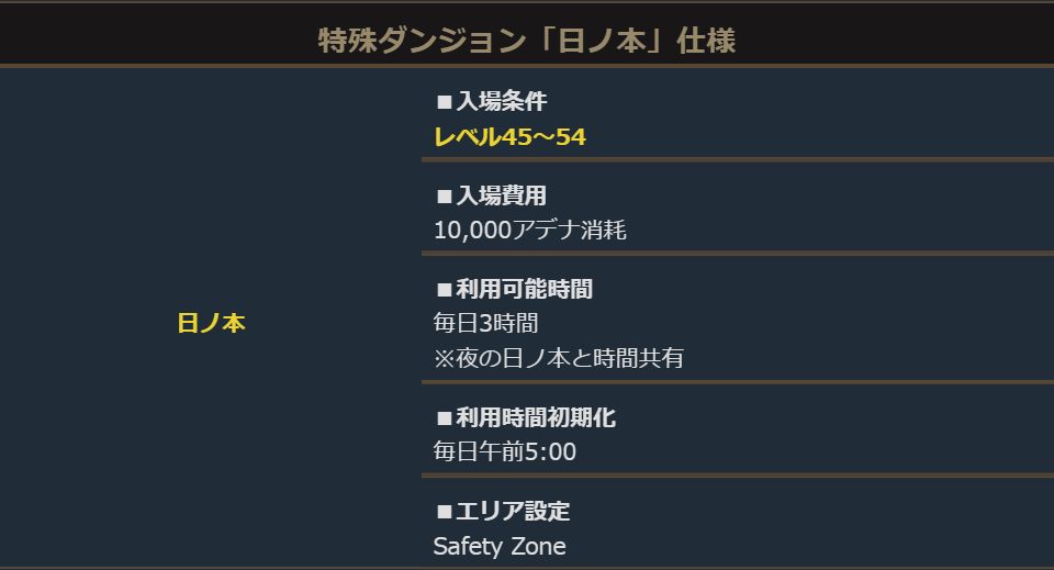 「日ノ本」はレベル45~54で利用可能な特殊ダンジョンです。