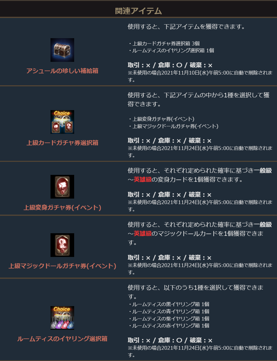 ※一部アイテムは未使用の場合、一定期間が経過すると自動で削除されます。詳しくは各アイテムの詳細をご確認ください。