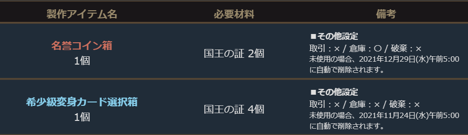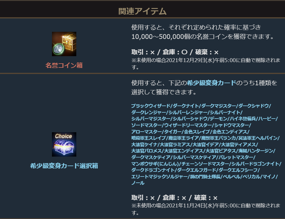 ※一部アイテムは未使用の場合、一定期間が経過すると自動で削除されます。詳しくは各アイテムの詳細をご確認ください。