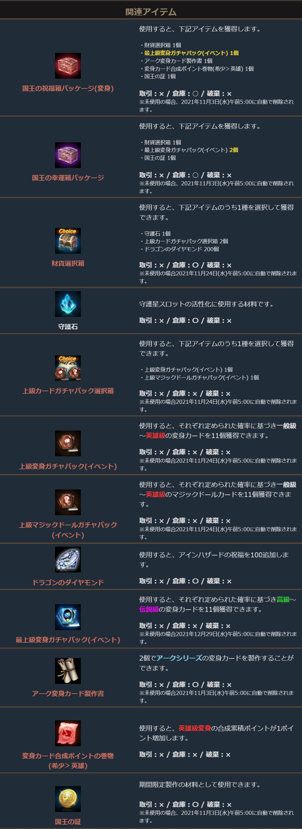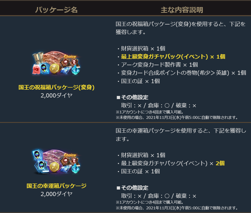 「国王の祝福箱パッケージ(変身)」及び「国王の幸運箱パッケージ」に含まれる一部商品内容を下記の通り修正しました。
