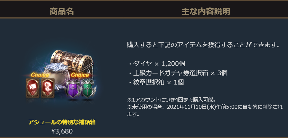 ダイヤと上級ガチャ券、好きな紋章1種を選んで獲得できる「紋章選択箱」がセットになったお得なパッケージです。