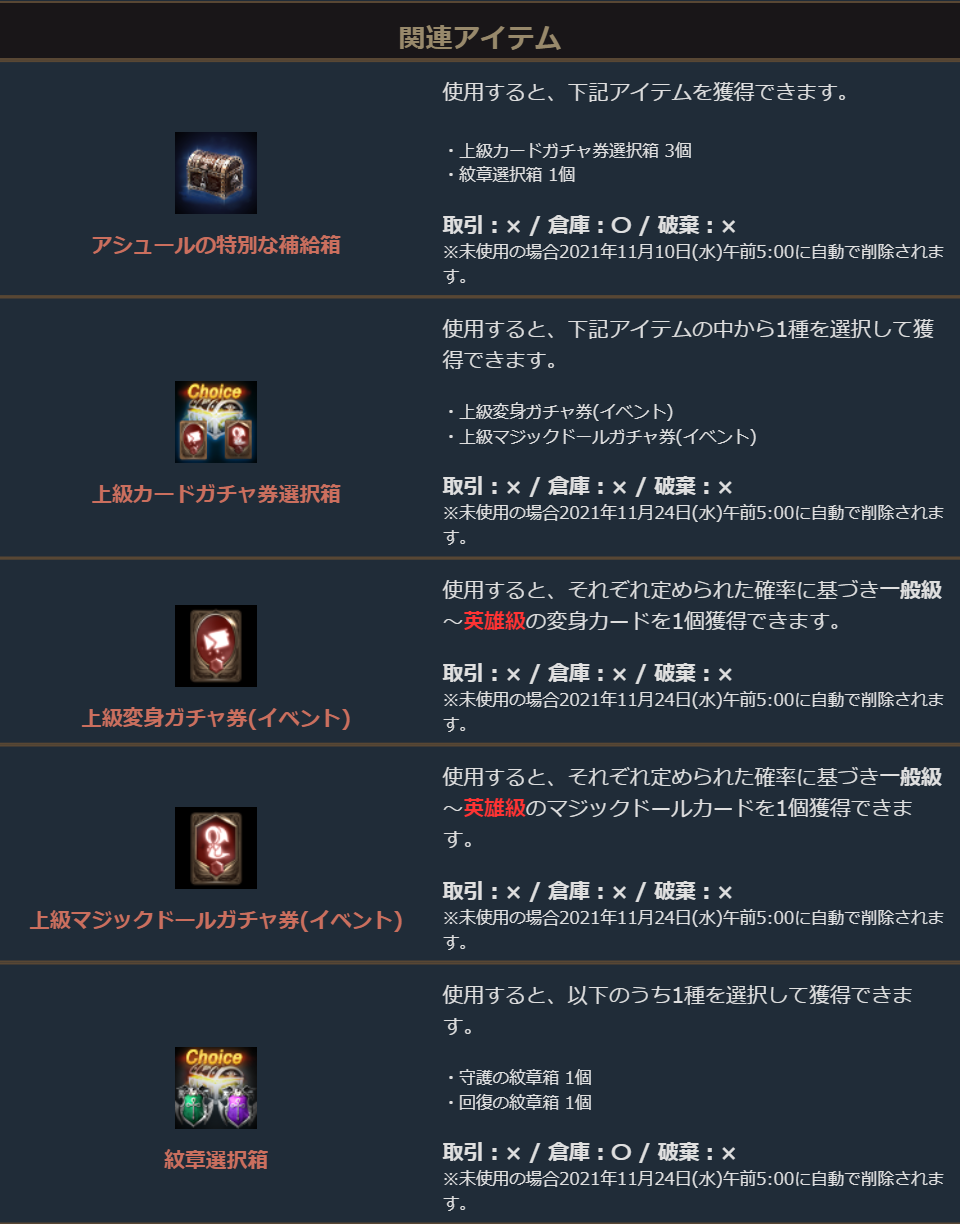 ※一部アイテムは未使用の場合、一定期間が経過すると自動で削除されます。詳しくは各アイテムの詳細をご確認ください。