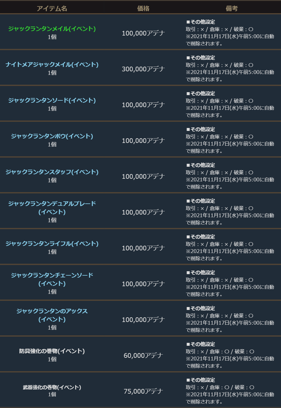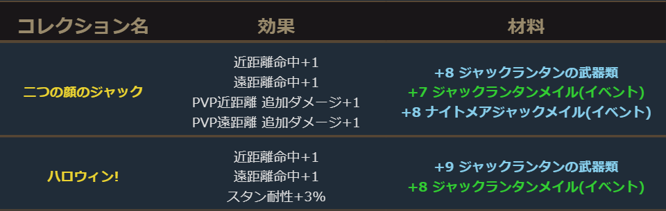 ハロウィンイベント商人からは強化することでイベントコレクションに登録することができる各種イベント防具/イベント武器を購入することができます。