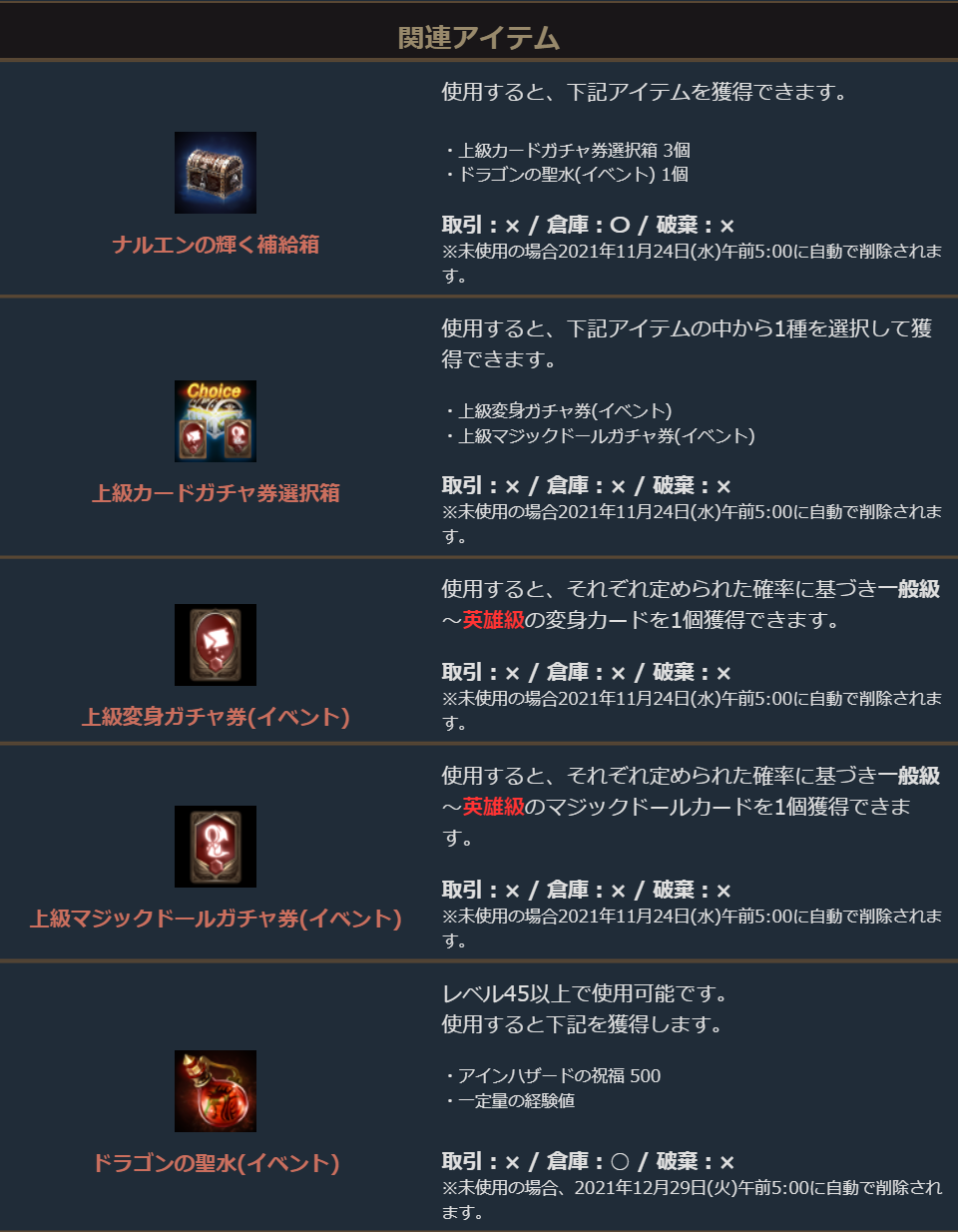 ※一部アイテムは未使用の場合、一定期間が経過すると自動で削除されます。詳しくは各アイテムの詳細をご確認ください。