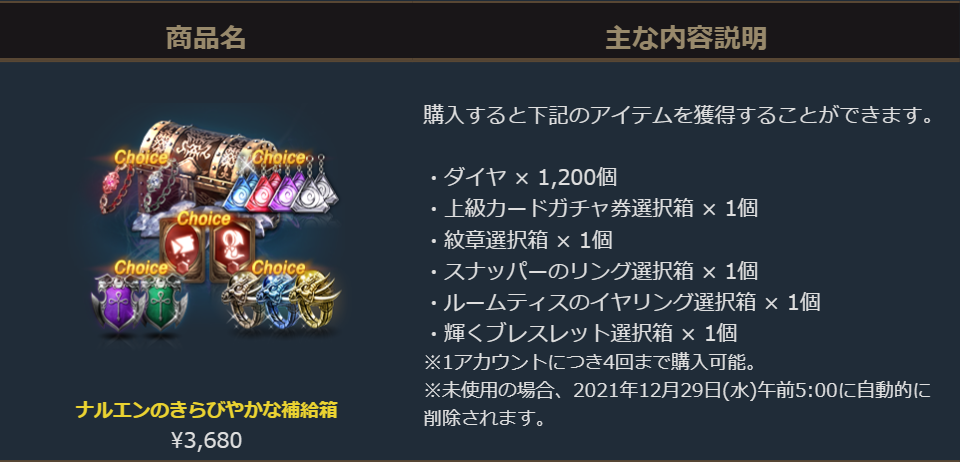 ダイヤと上級ガチャ券、各種装身具が選べるアイテムがセットになったお得なパッケージです。