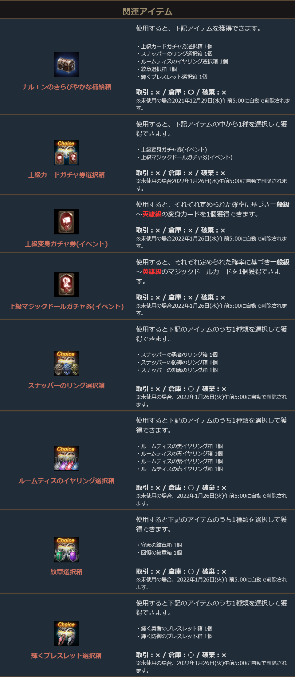 ※一部アイテムは未使用の場合、一定期間が経過すると自動で削除されます。詳しくは各アイテムの詳細をご確認ください。