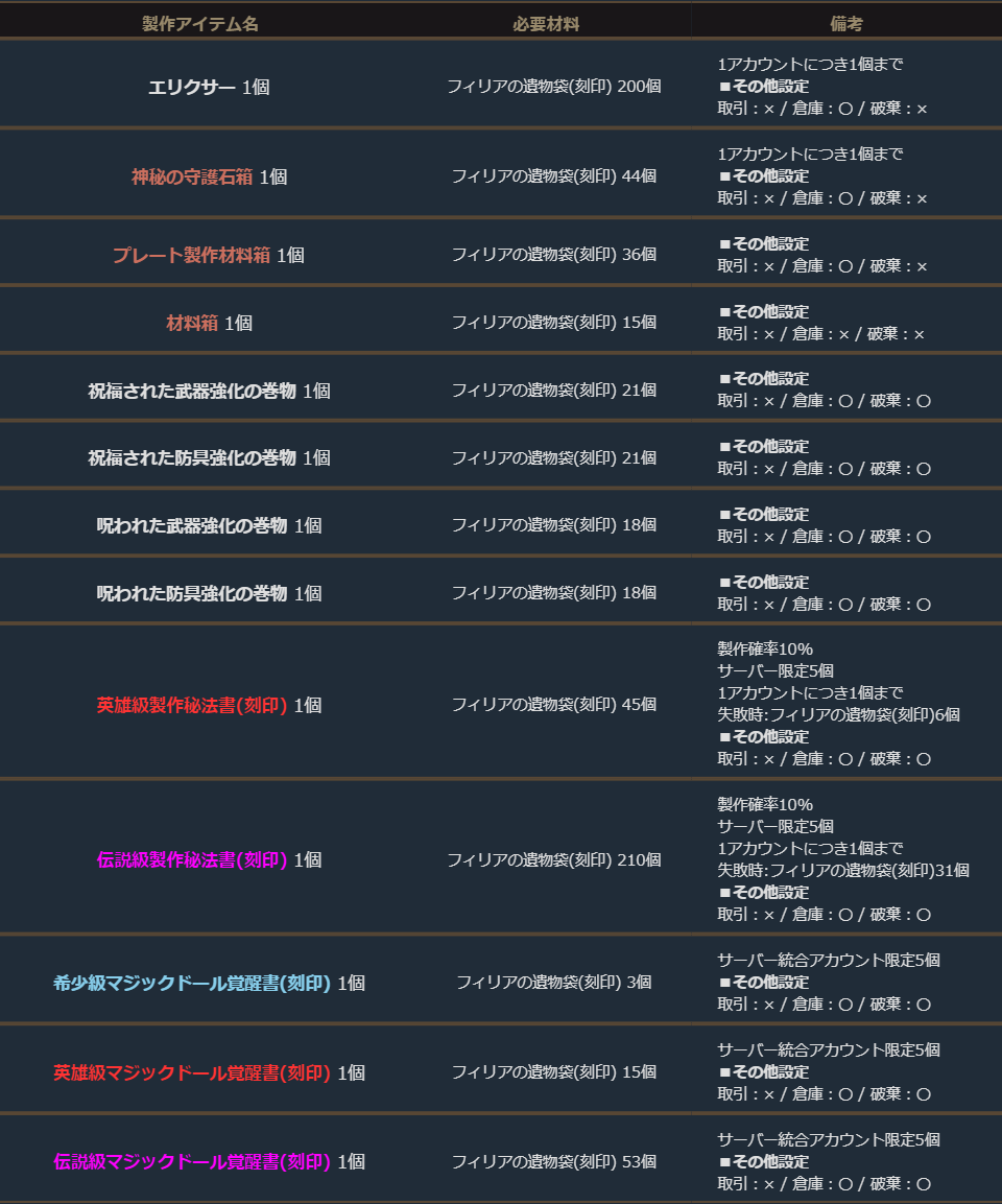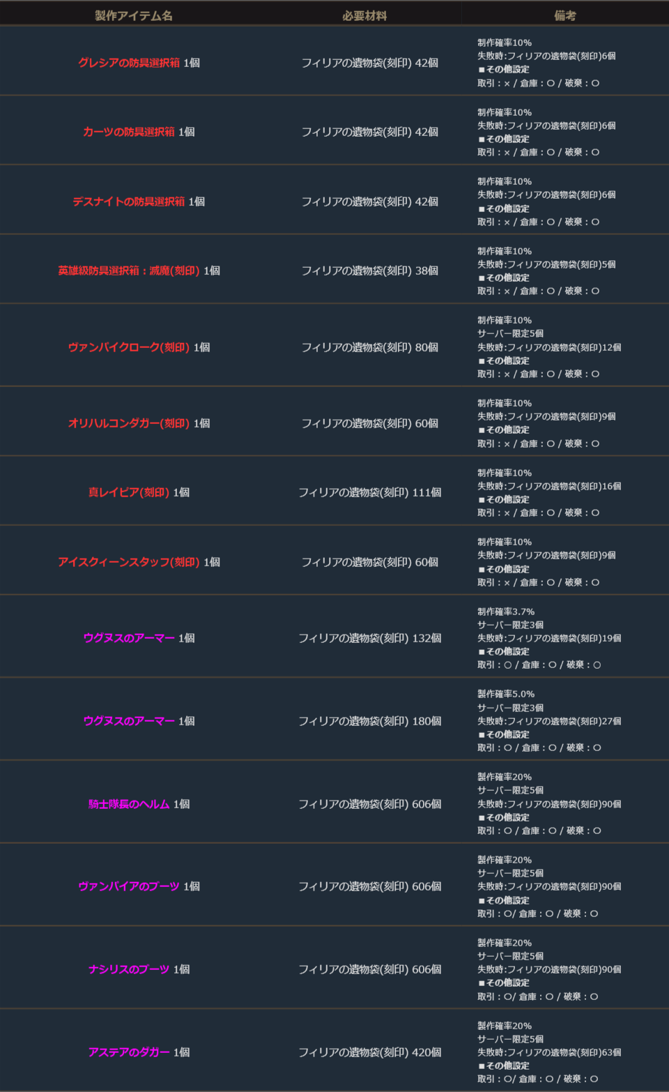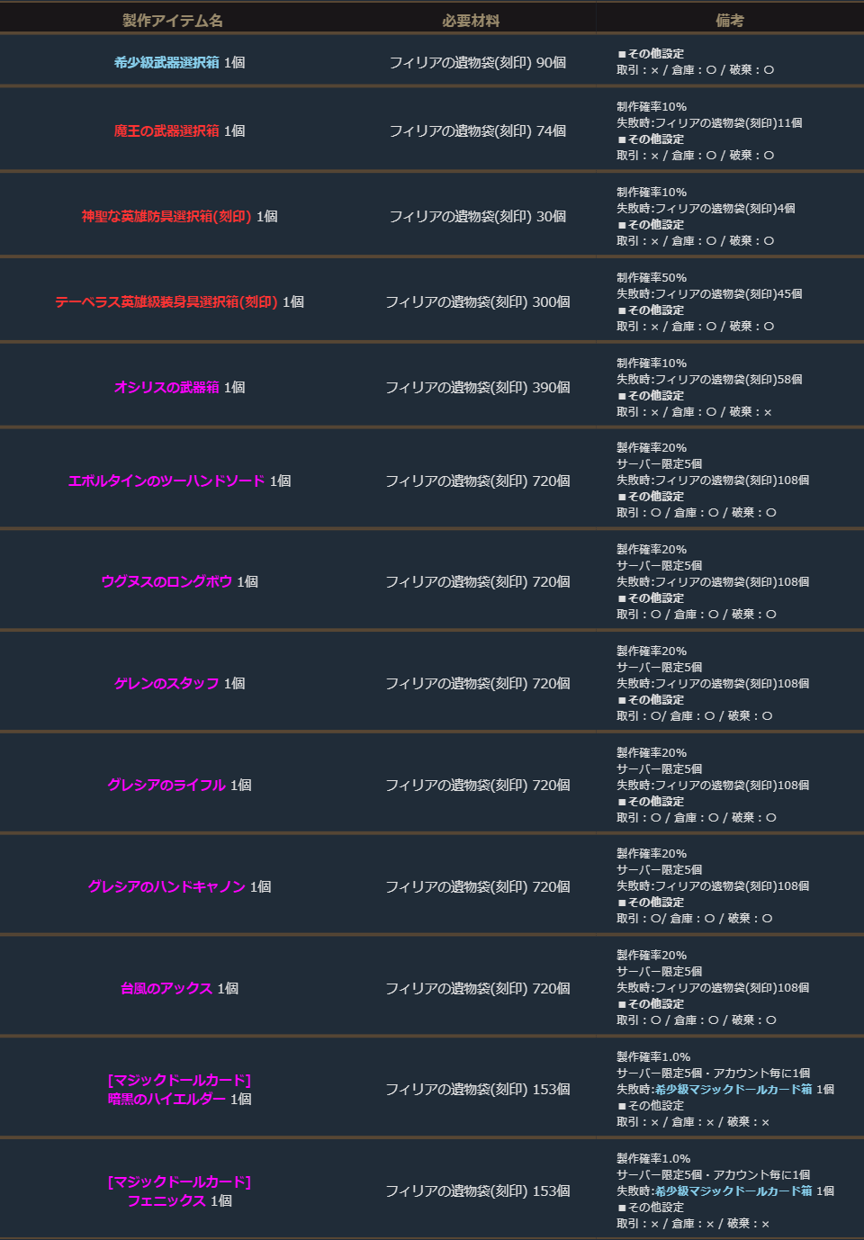 期間中、「フィリアの遺物袋(刻印)」を使用して、下記の製作を行うことができます。