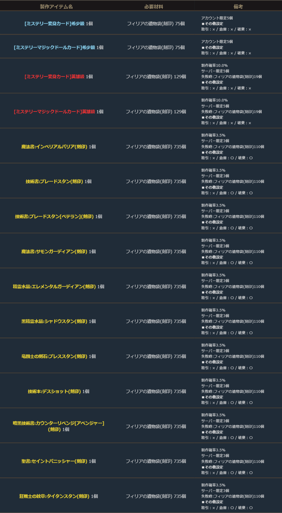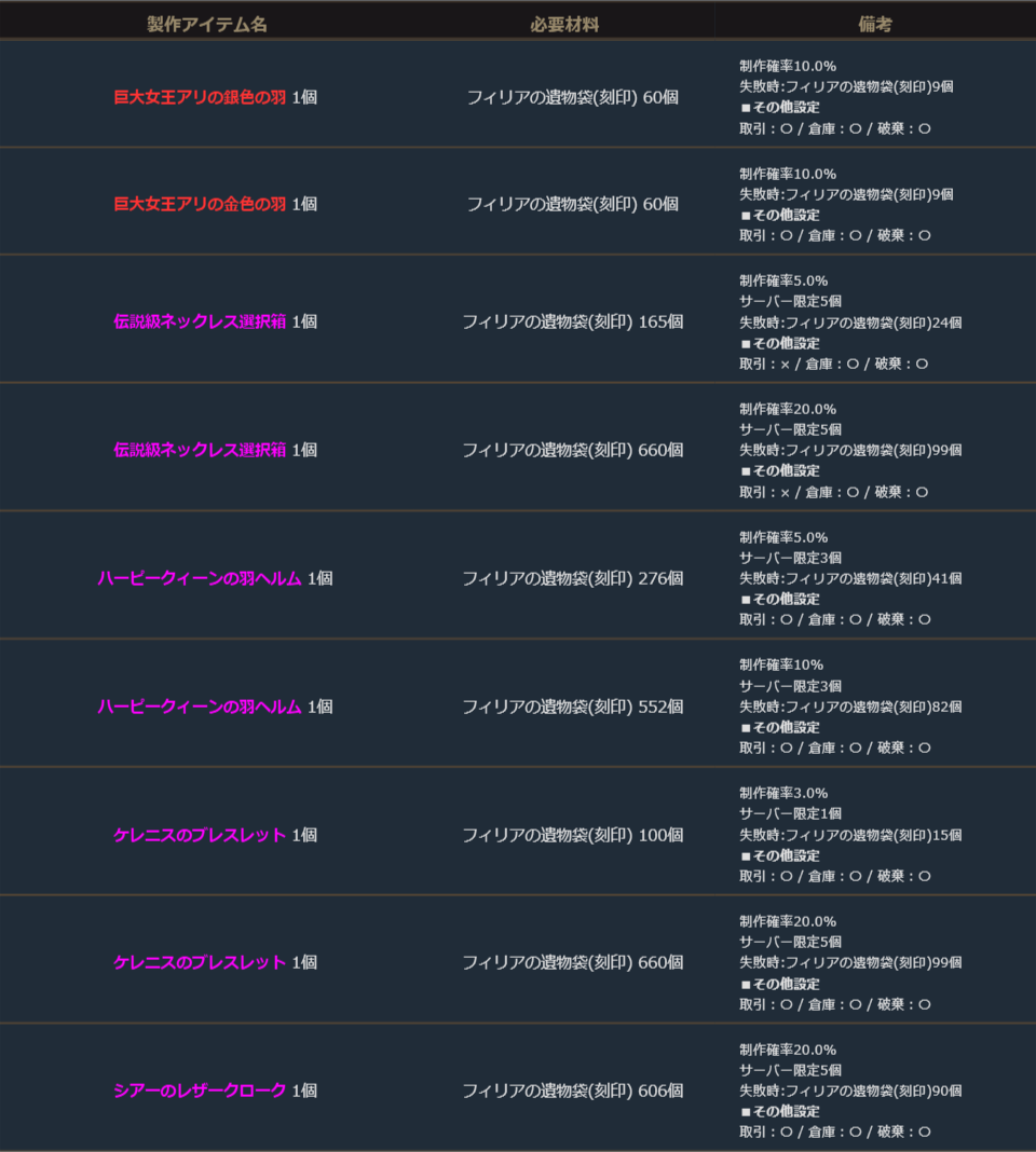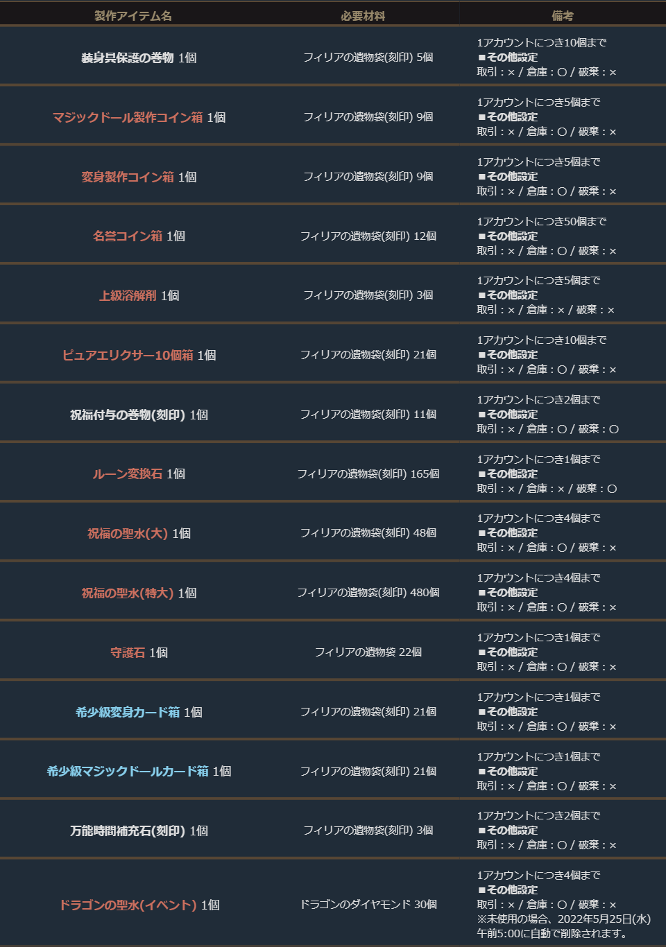 期間中、「フィリアの遺物袋(刻印)」を使用して、下記の製作を行うことができます。