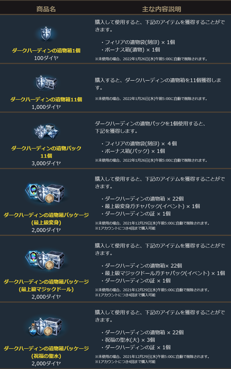 2021年11月24日より、ゲーム内ショップで「ダークハーディンの遺物箱」の販売を開始しました。