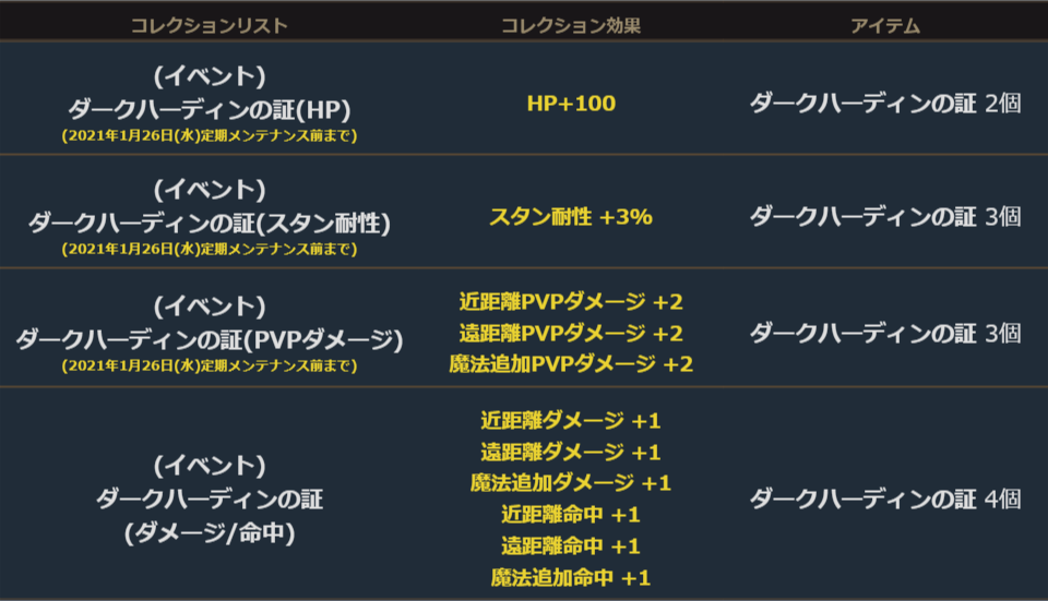 パッケージに付属する「ダークハーディンの証」を材料としてイベントコレクションに登録することができます。