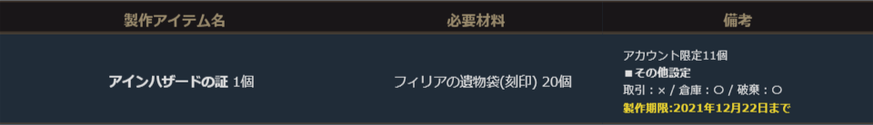 12月8日(水)~12月22日(水)までの間しか製作できない「アインハザードの証」が掲載されておりましたので削除いたしました。