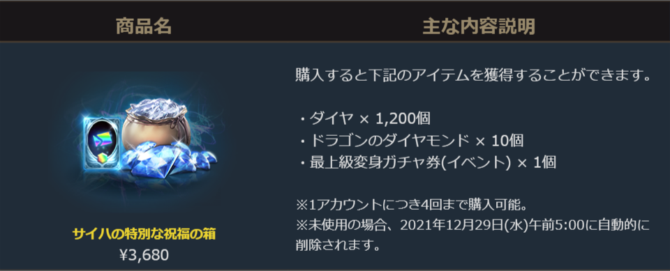 ダイヤとドラゴンのダイヤモンド、最上級変身ガチャ券のアイテムがセットになったお得なパッケージです。