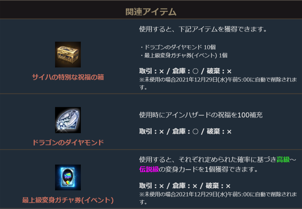 ※一部アイテムは未使用の場合、一定期間が経過すると自動で削除されます。詳しくは各アイテムの詳細をご確認ください。
