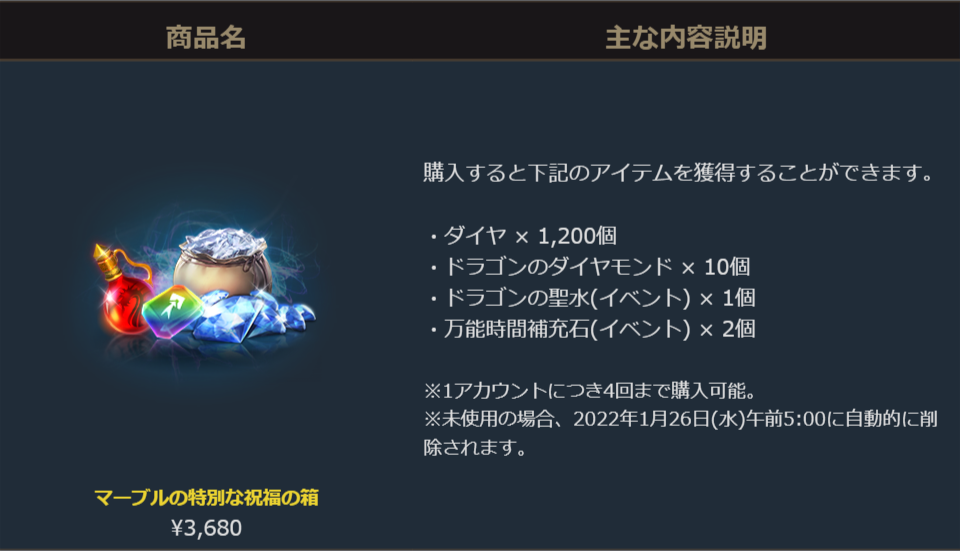 ダイヤとドラゴンの聖水、万能時間補充石のアイテムがセットになったお得なパッケージです。