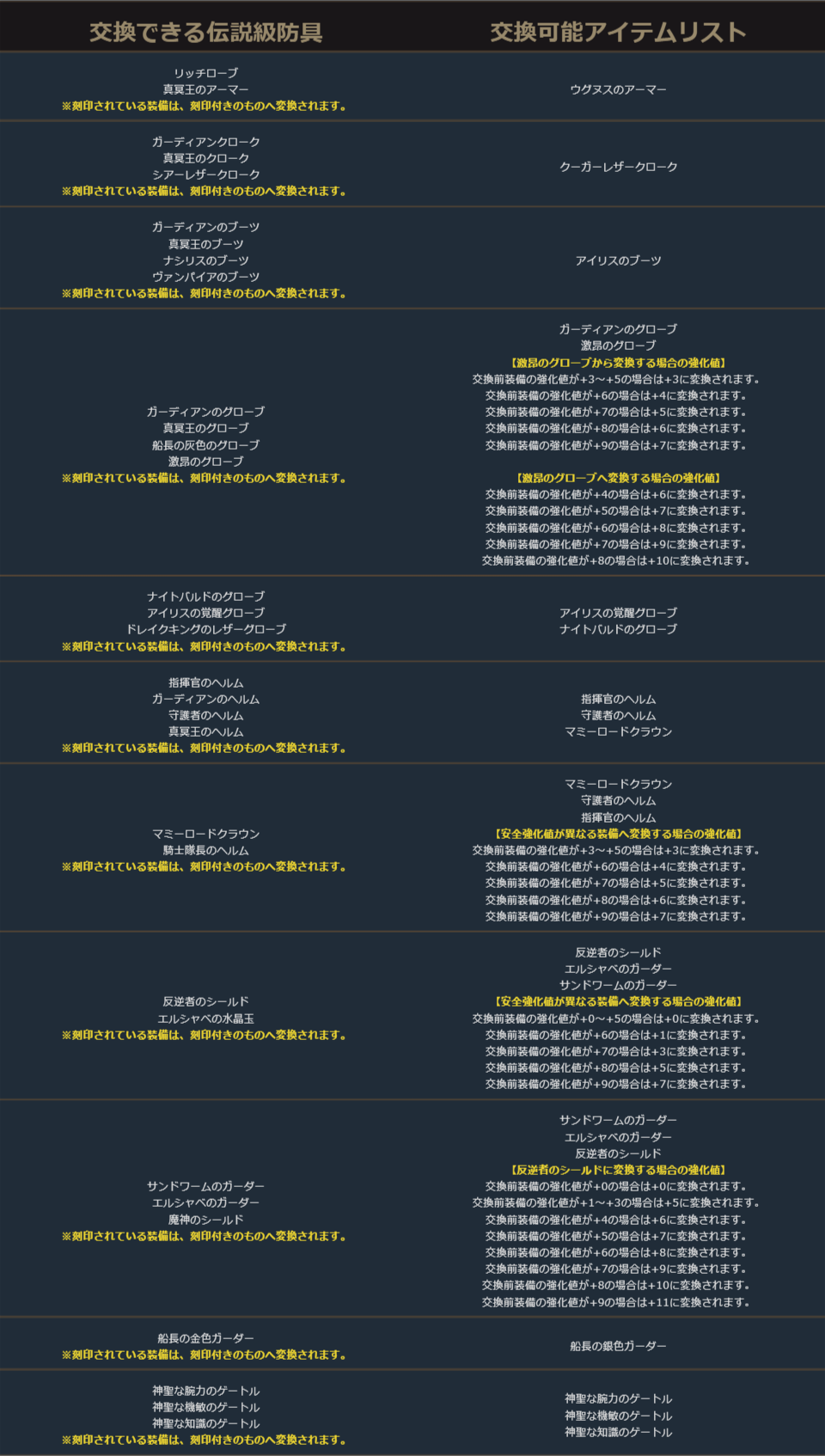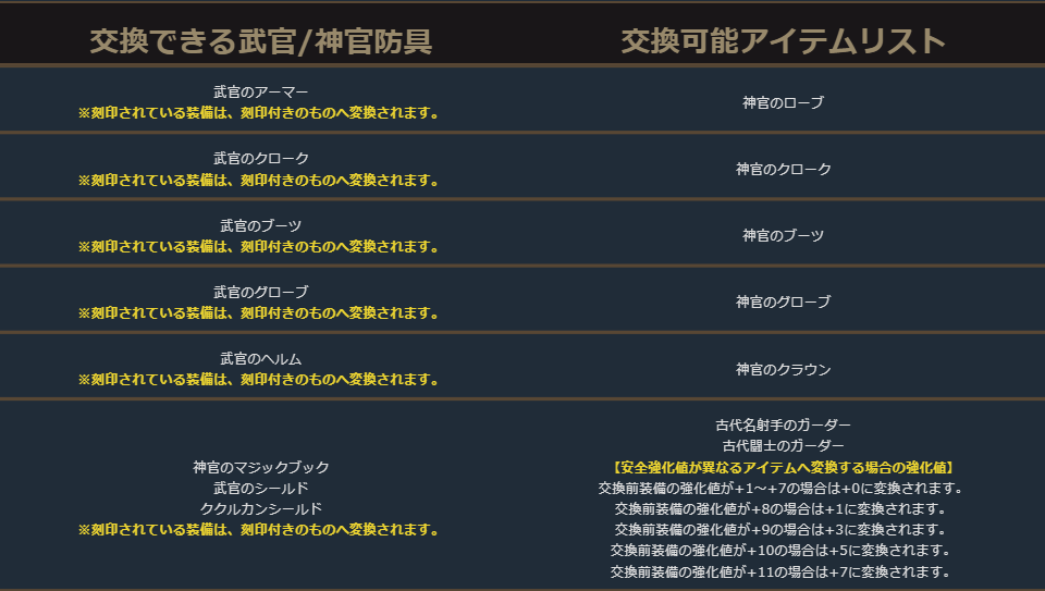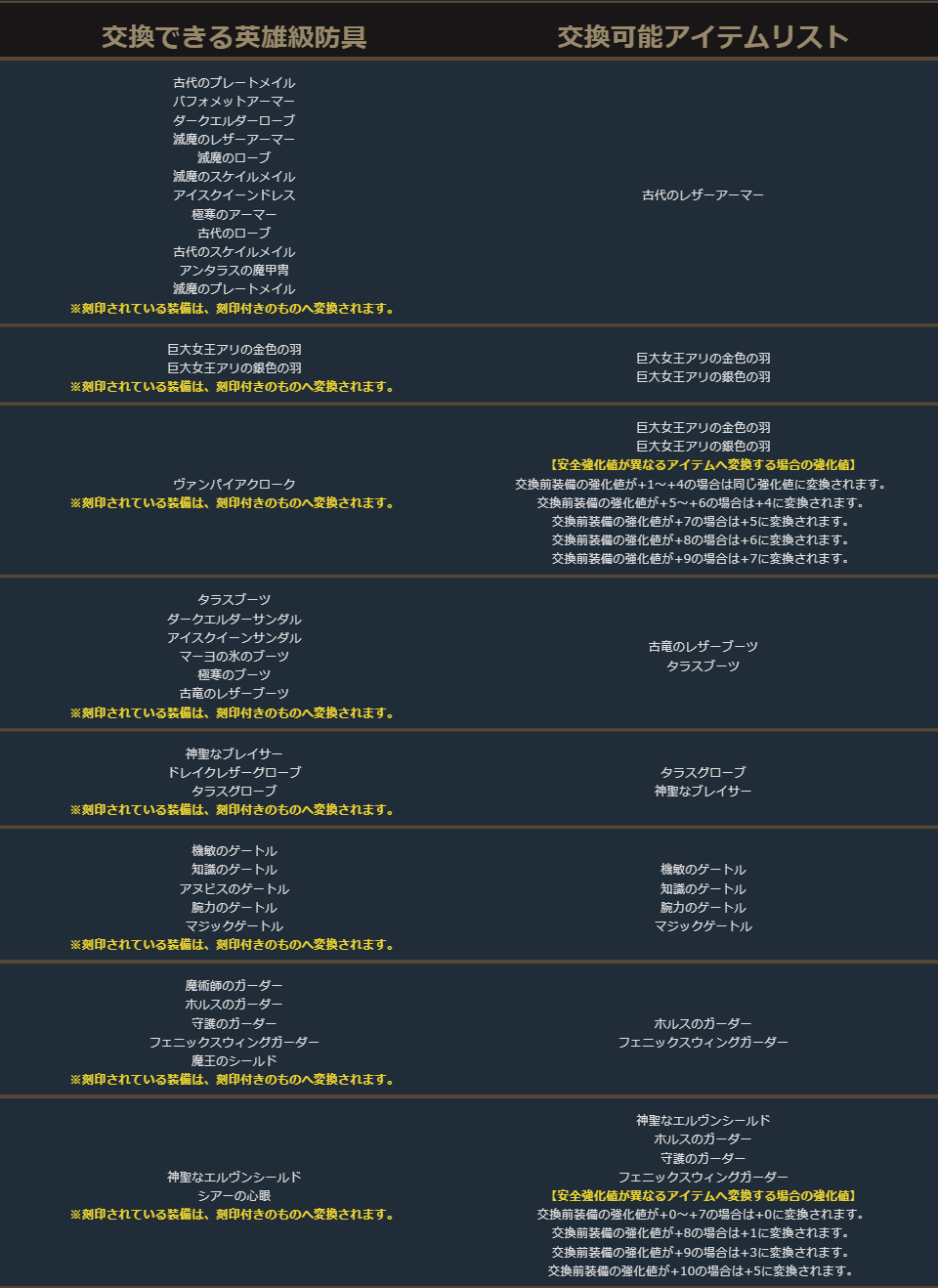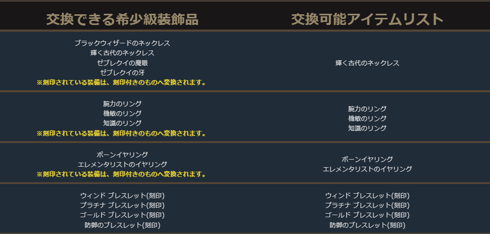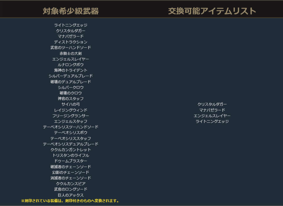 クラスチェンジを行う際に交換可能なアイテムは、下記の希少級以上のクラスチェンジ前のキャラクターが装備可能なアイテムが対象となります。