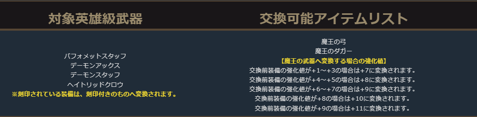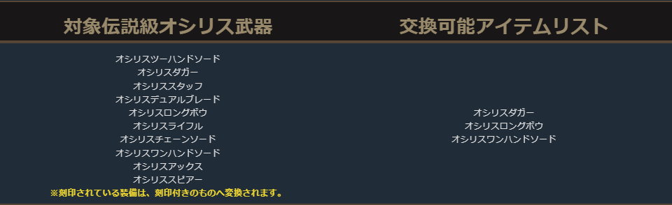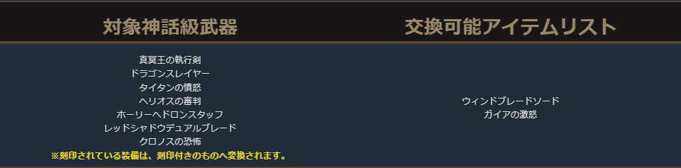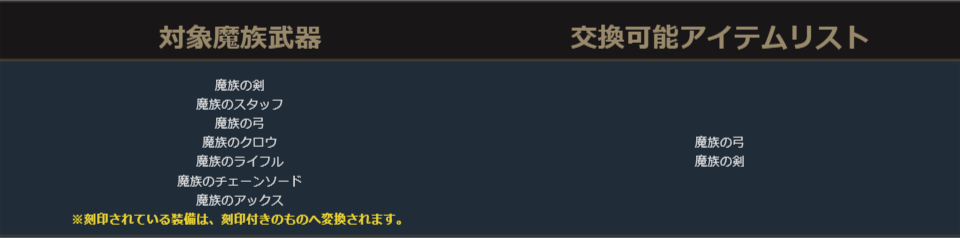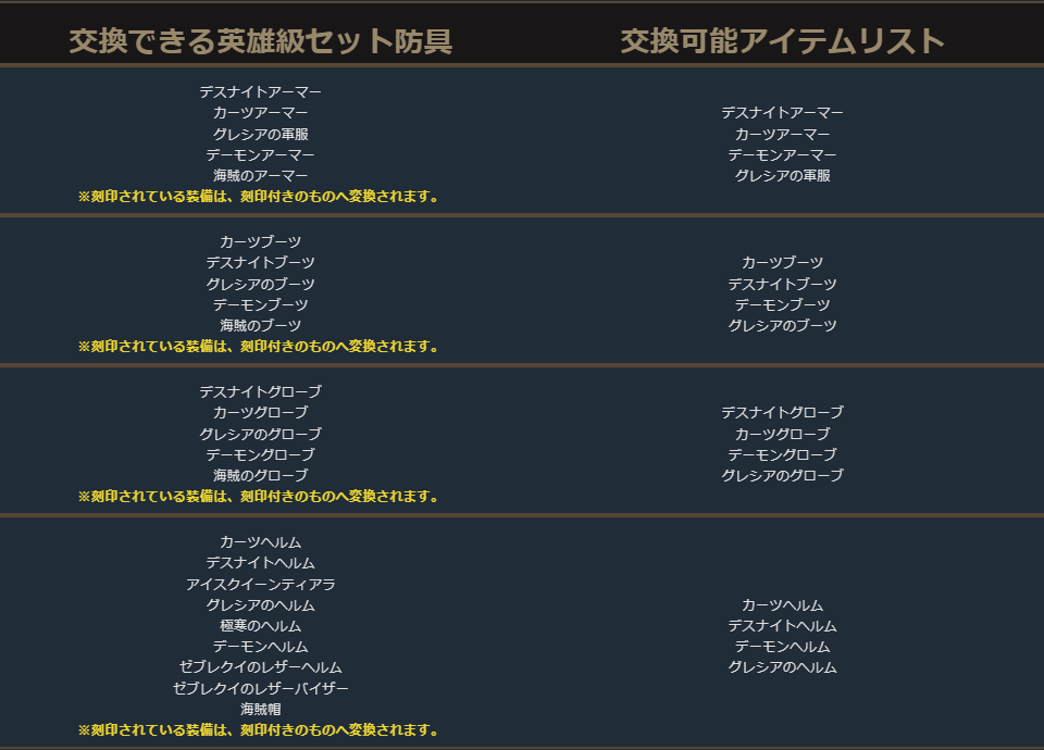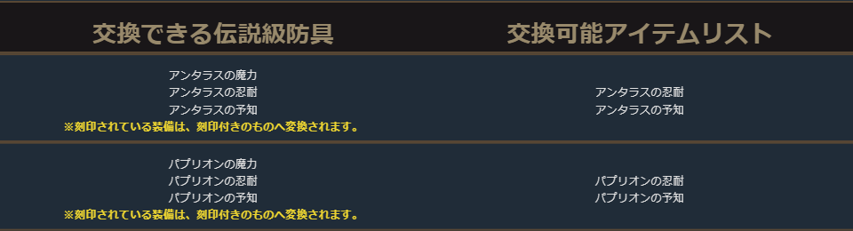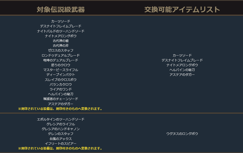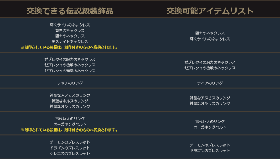 クラスチェンジを行う際に交換可能なアイテムは、下記の希少級以上のクラスチェンジ前のキャラクターが装備可能なアイテムが対象となります。