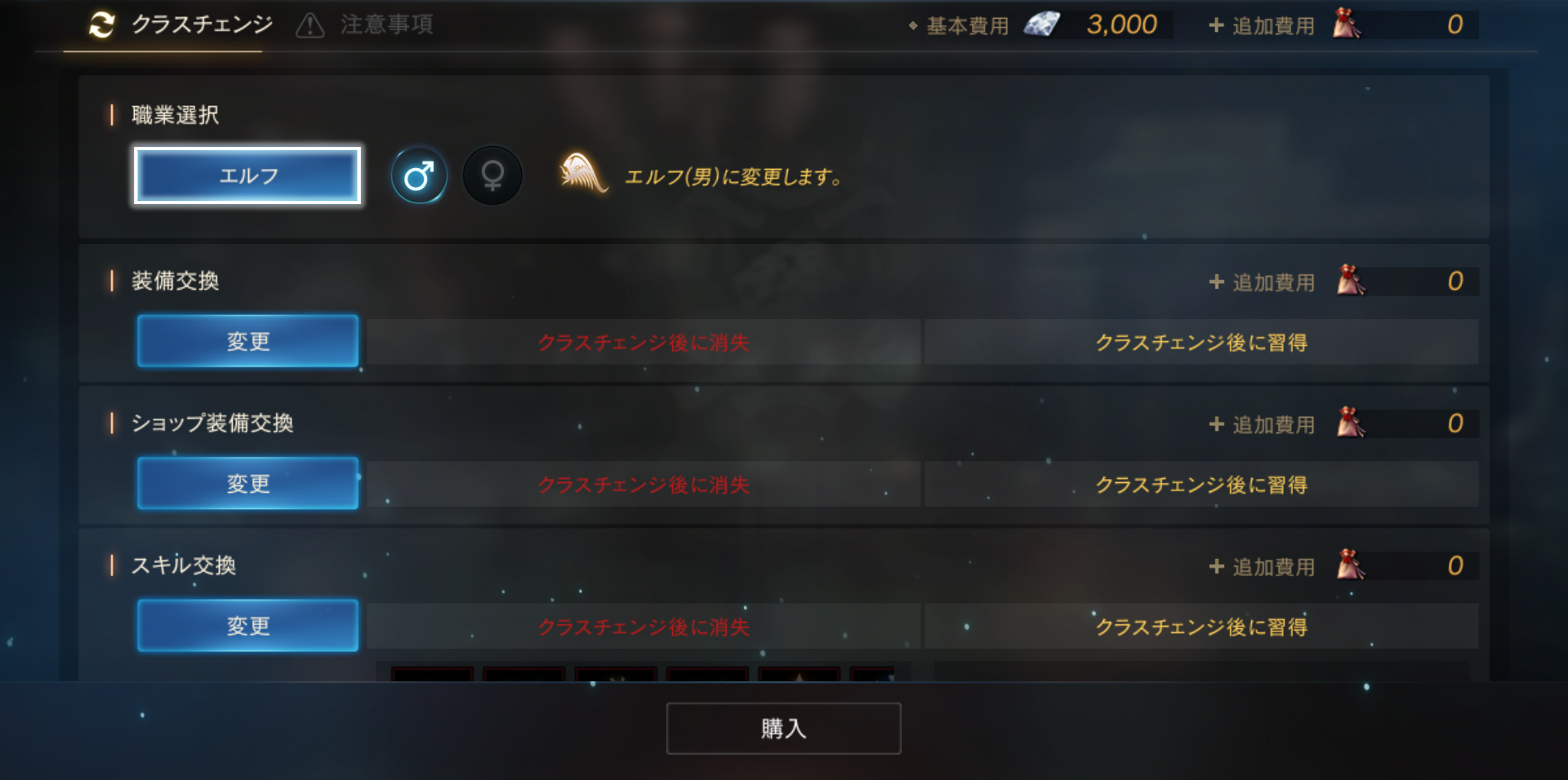 クラスチェンジとは、商品を購入したキャラクターの職業を、キャラクター名と経験値を維持したまま「エルフへ変更」するサービスです。