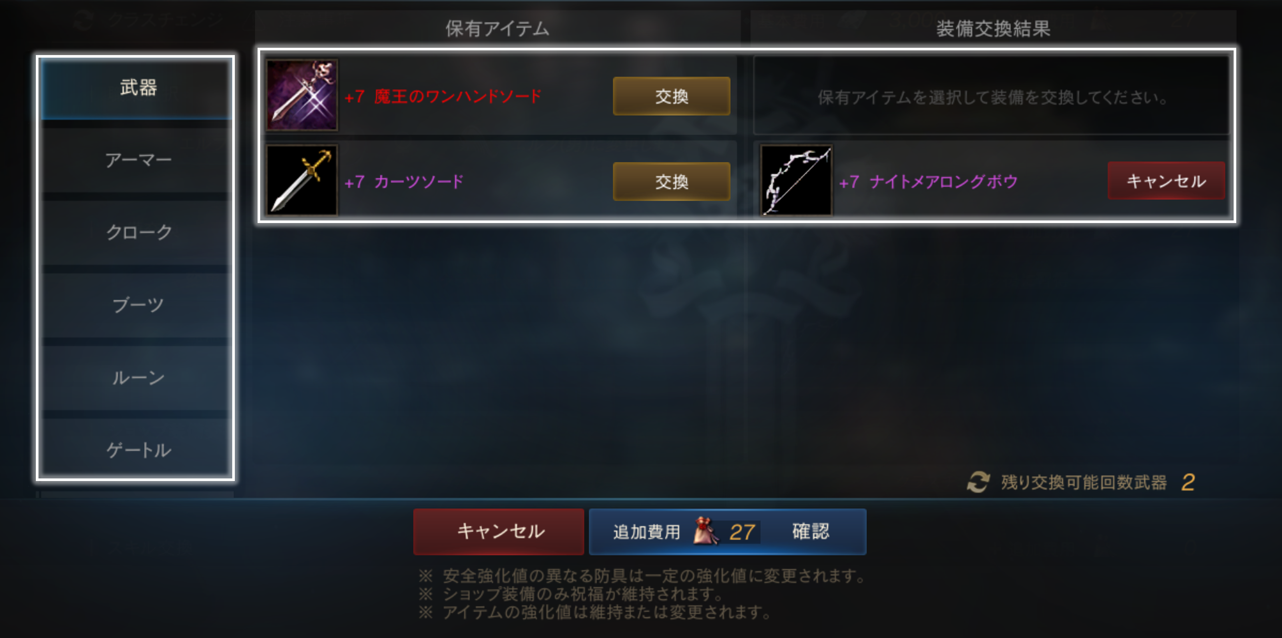 ※【ご注意】本項目で装備の交換を行わない場合、後から交換することは出来ませんので必ず忘れないようお願い致します。