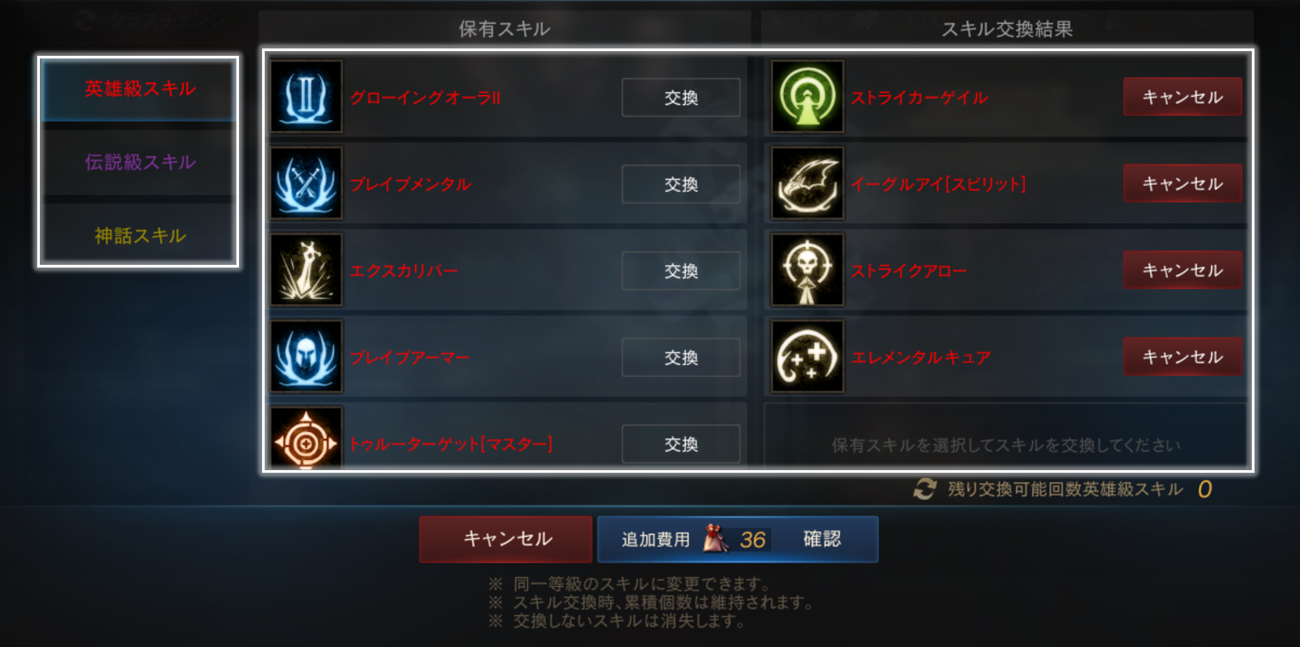 変換できるのは英雄・伝説級スキルが最大4つまで、神話級のスキルの交換は最大1つまでとなります。
