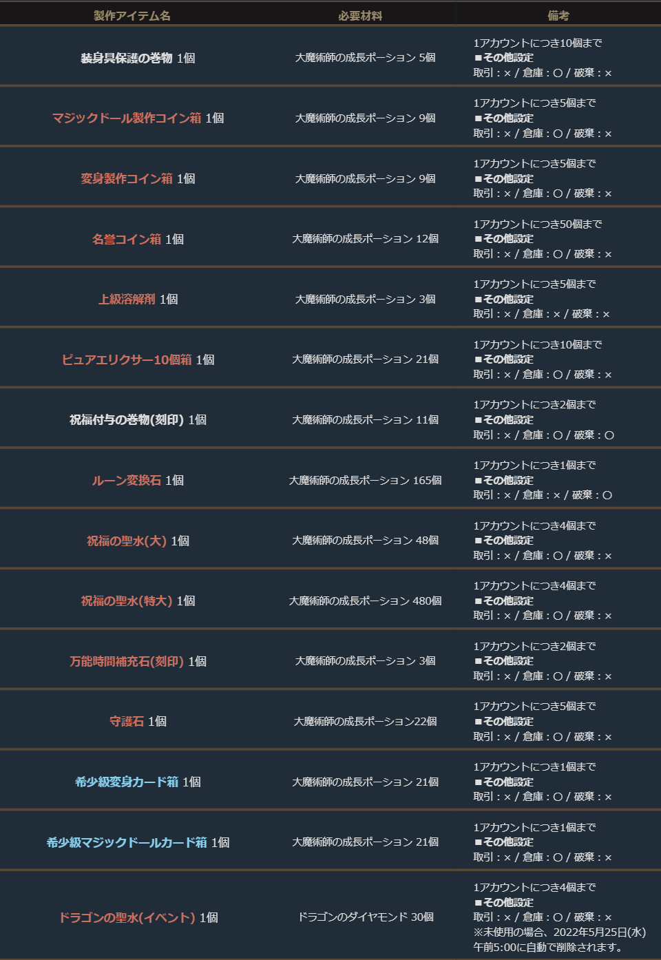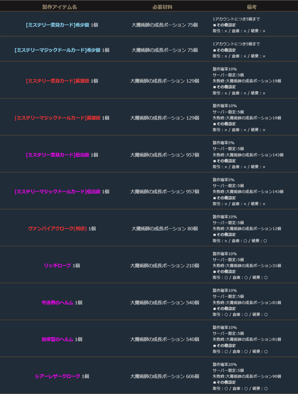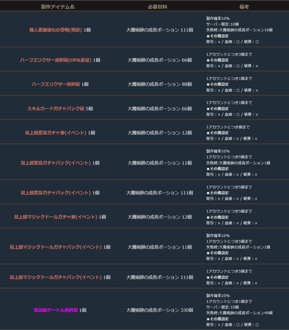 期間中、「大魔術師の成長ポーション」を使用して、下記の製作を行うことができます。