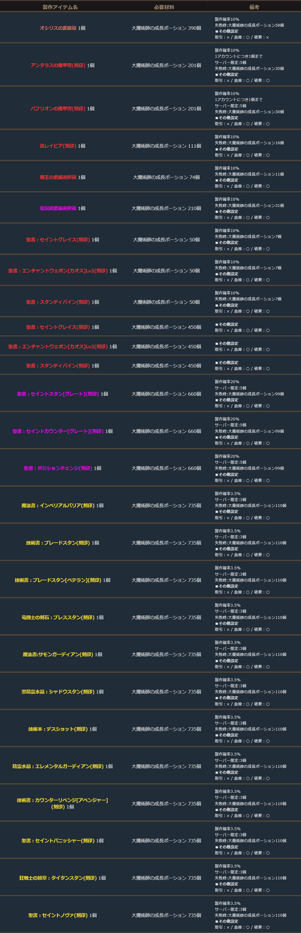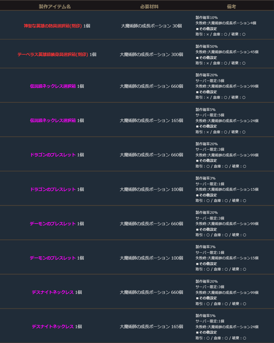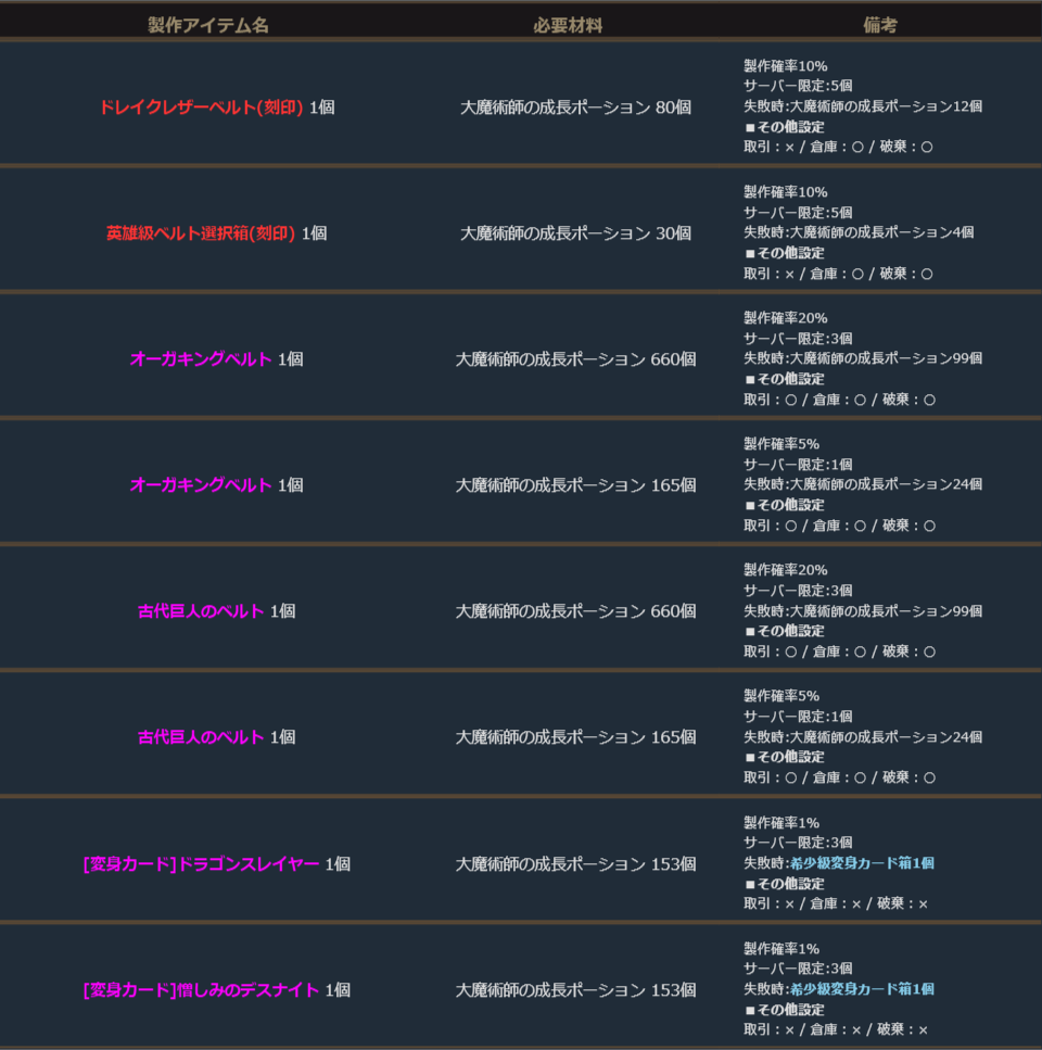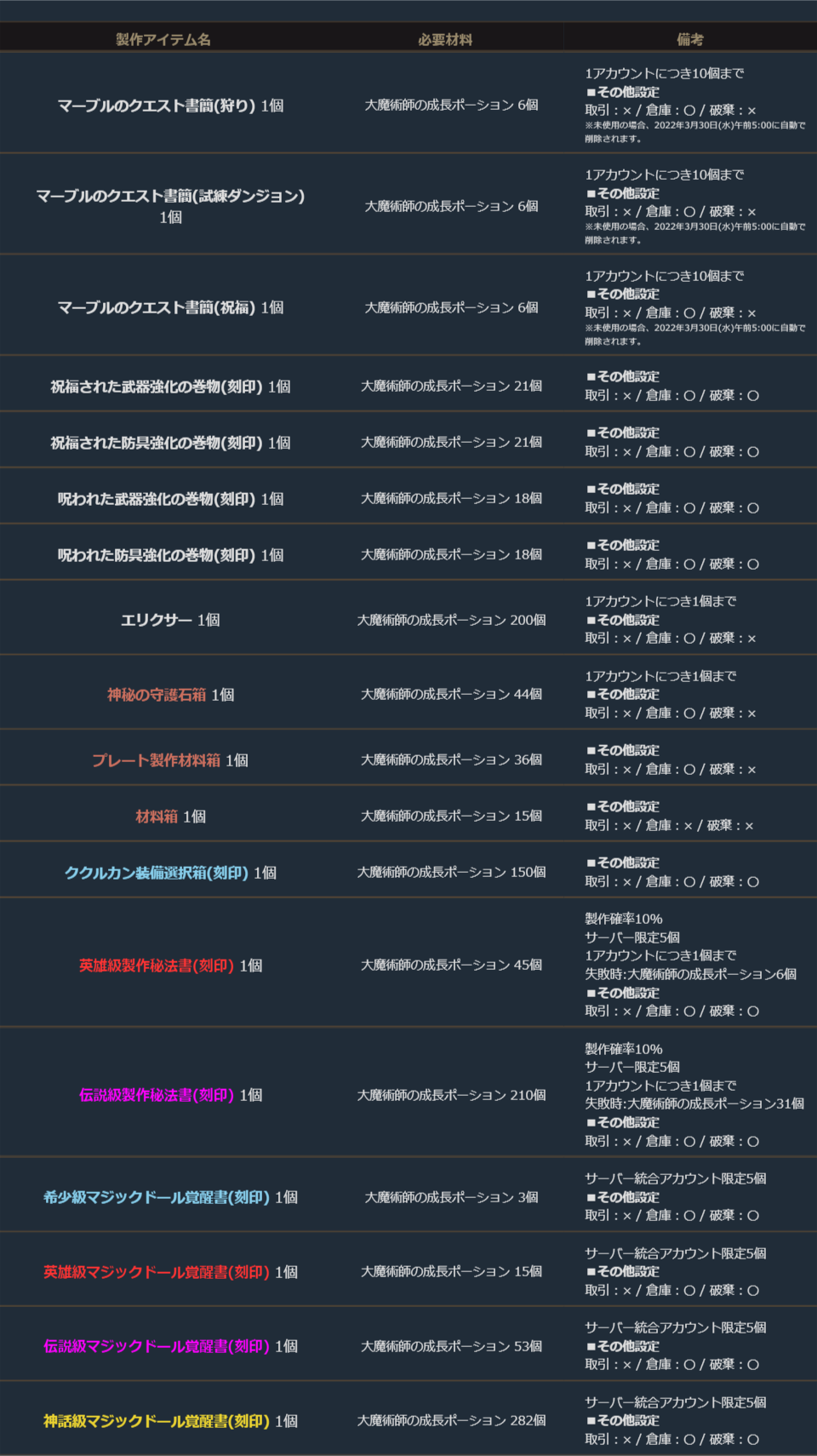 期間中、「大魔術師の成長ポーション」を使用して、下記の製作を行うことができます。