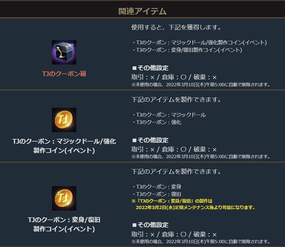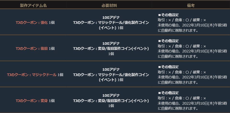 ※「TJ」のクーポン:変身」「TJのクーポン:復旧」を製作材料として「TJのクーポン:変身/復旧製作コイン(イベント)」1個を製作可能です。