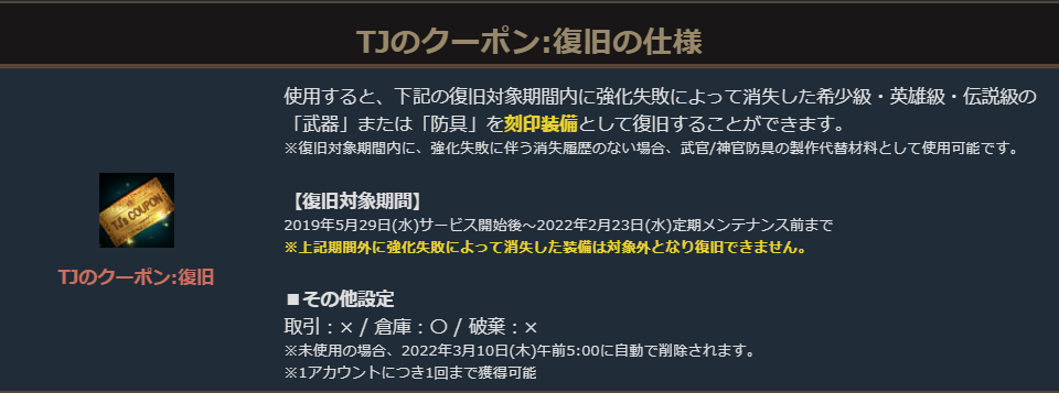TJのクーポン:復旧は、対象期間内に希少級・英雄級・伝説級で強化失敗した武器や防具を復旧することができる特別なアイテムです。