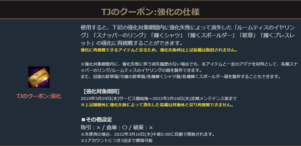 ・「TJのクーポン:強化」は、対象期間内に強化失敗した「ルームティスのイヤリング」「スナッパーのリング」「輝くシャツ」「輝くスポールダー」「紋章」「輝くブレスレット」の強化に再挑戦できるアイテムとなり、失敗したアイテムを復旧するアイテムではございません。