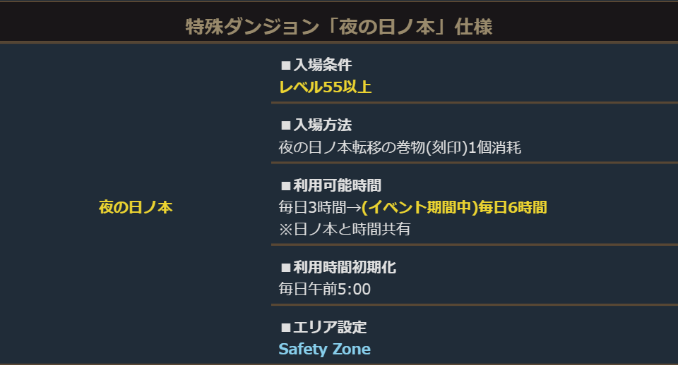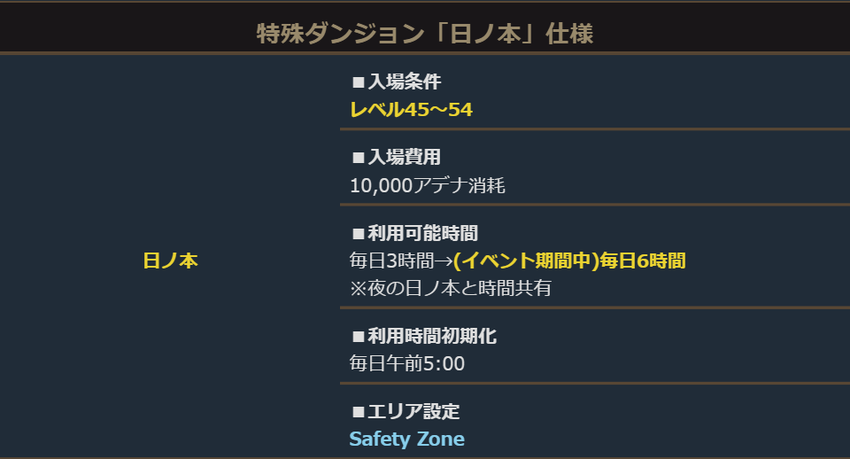 期間中、特殊ダンジョン「日ノ本」「夜の日ノ本」の利用可能時間が2倍になります!
