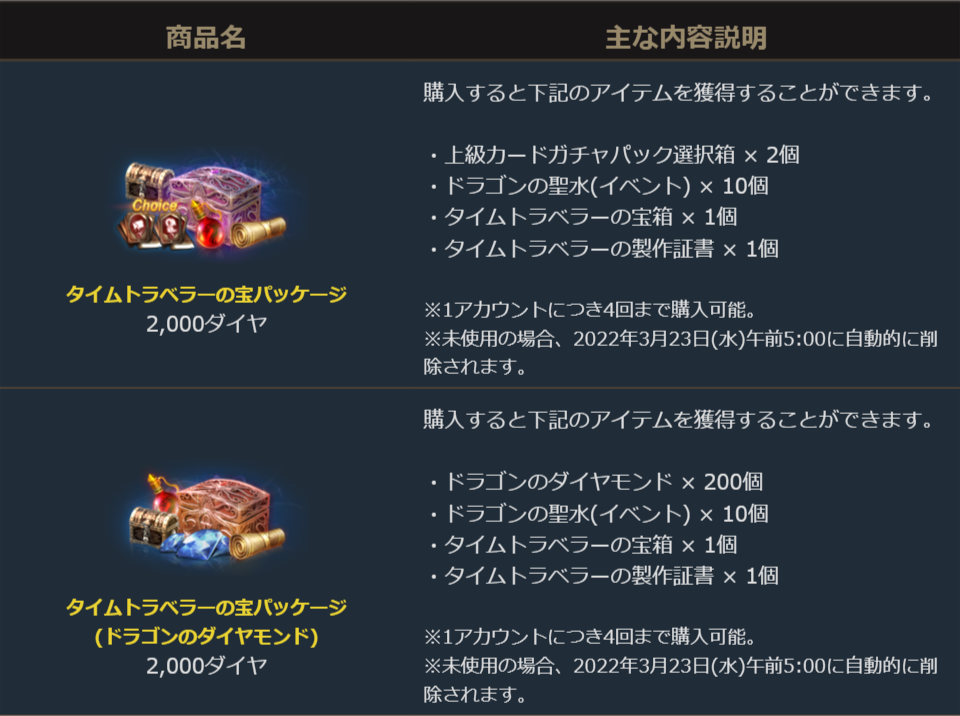 2022年3月2日より販売を開始しました「タイムトラベラーの宝パッケージ」と「タイムトラベラーの宝パッケージ(ドラゴンのダイヤモンド)」に関しまして、ご案内を申し上げます。
