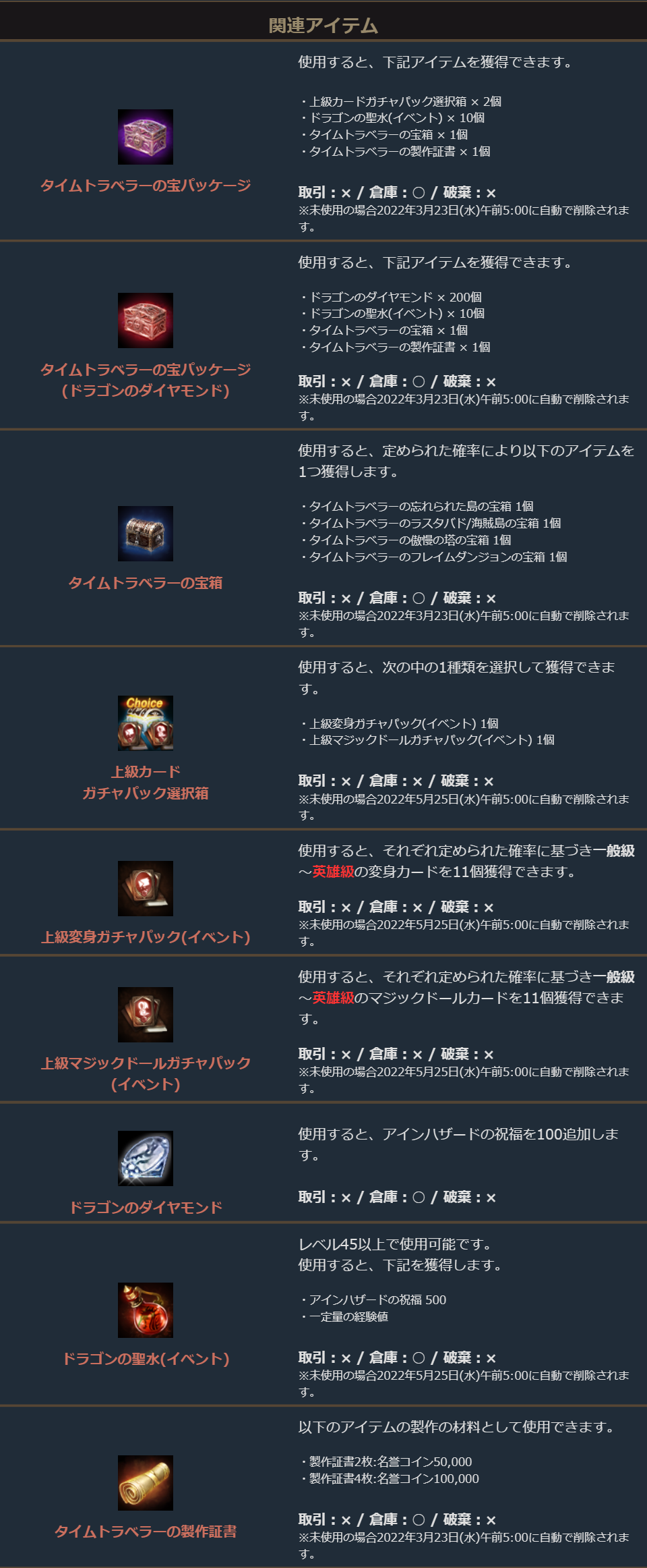 「上級カードガチャパック選択箱」や「ドラゴンのダイヤモンド」「ドラゴンの聖水(イベント)」が手に入るほか、「タイムトラベラーの宝箱」からは各種ダンジョンの補充石やアイテムが手に入るパッケージになっております。