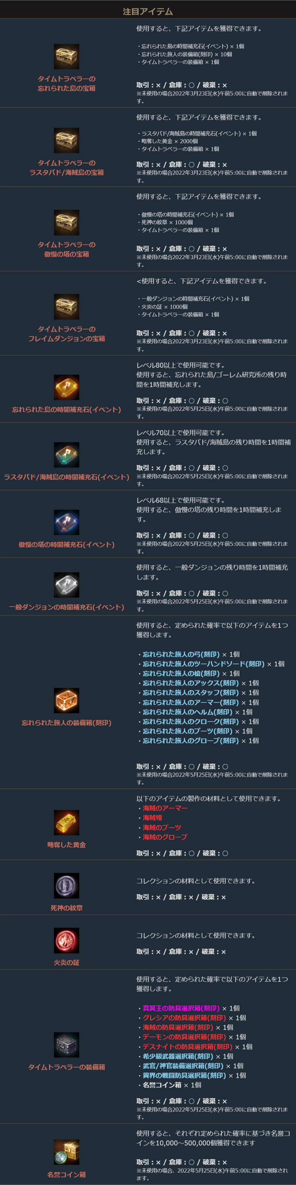 ※一部アイテムは未使用の場合、一定期間が経過すると自動で削除されます。詳しくは各アイテムの詳細をご確認ください。