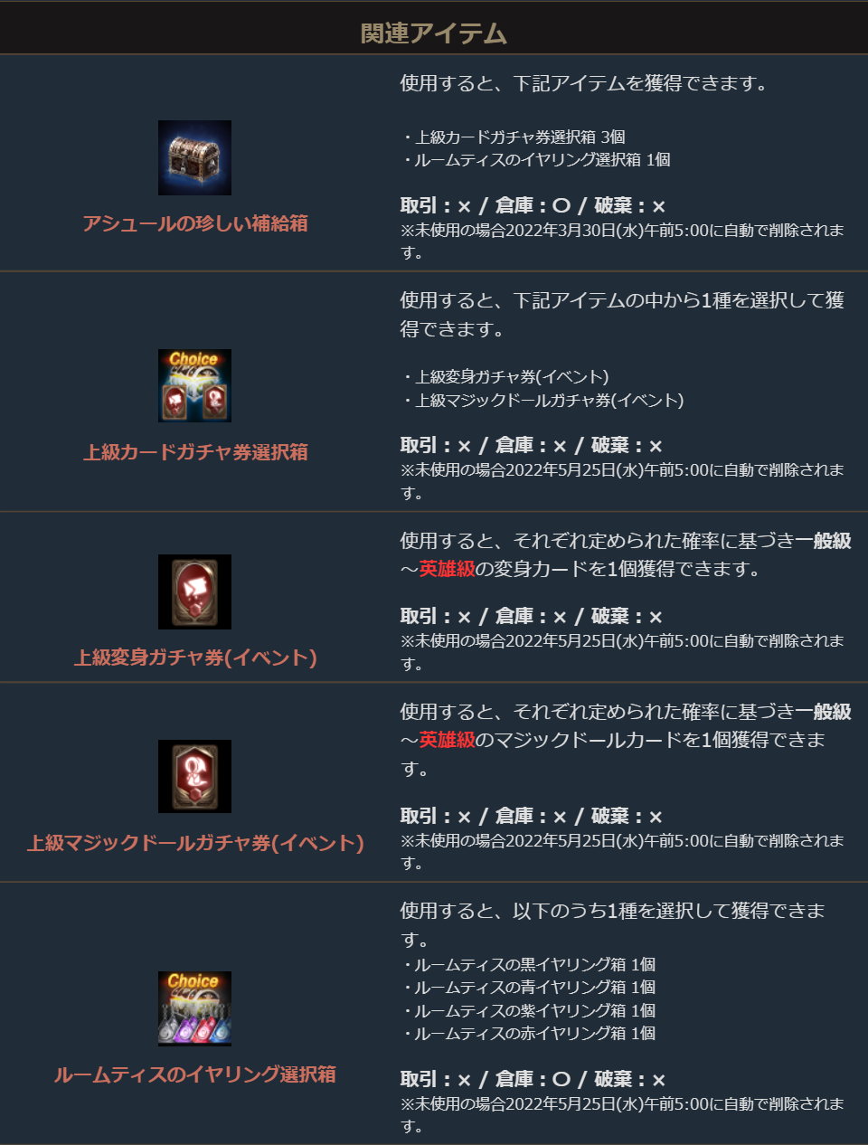 ※一部アイテムは未使用の場合、一定期間が経過すると自動で削除されます。詳しくは各アイテムの詳細をご確認ください。