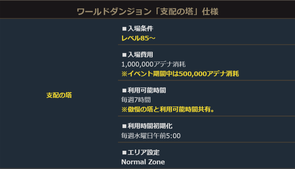 期間中、レベル85以上のキャラクターは「メニュー>ダンジョン>ワールドダンジョン」より「支配の塔」へ入場できます