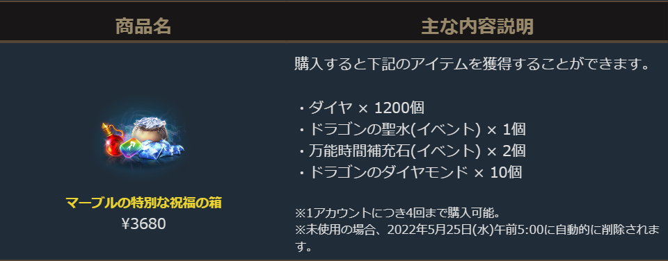 ダイヤに加えて「ドラゴンの聖水(イベント)」や「万能時間補充石(イベント)」といった狩りや育成に役立つアイテムがセットになったお得なパッケージです。