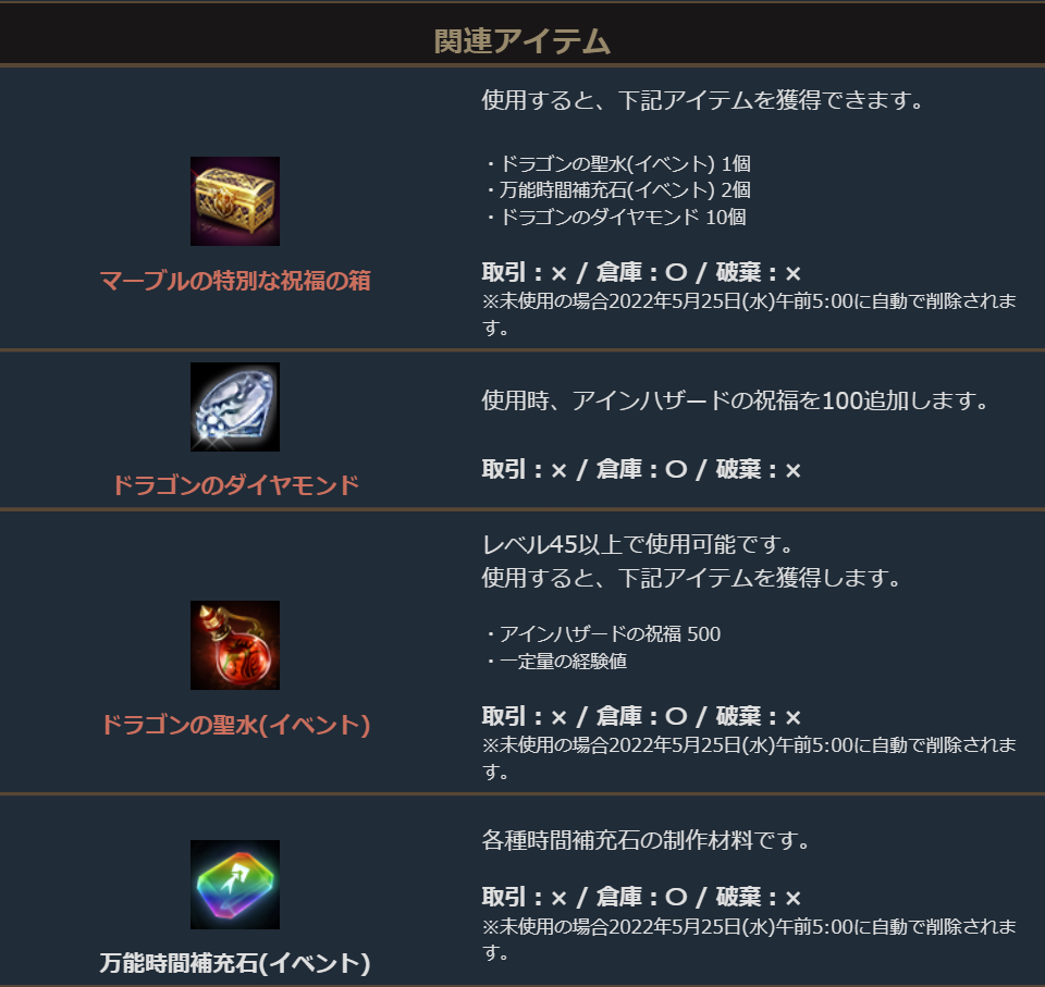 ※一部アイテムは未使用の場合、一定期間が経過すると自動で削除されます。詳しくは各アイテムの詳細をご確認ください。