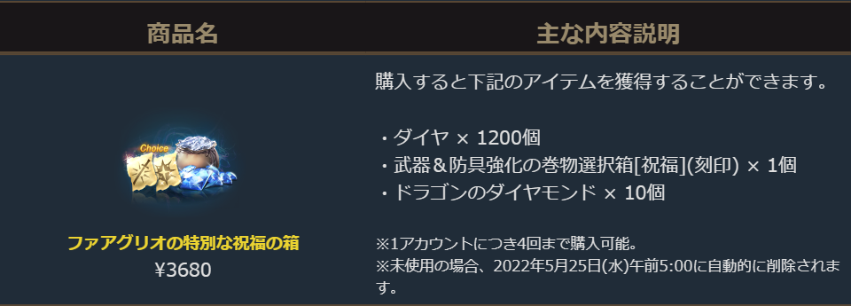 ダイヤに加えて「ドラゴンのダイヤモンド」や装備の強化に役立つ「武器&防具強化の巻物選択箱[祝福](刻印)」がセットになったお得な商品です。