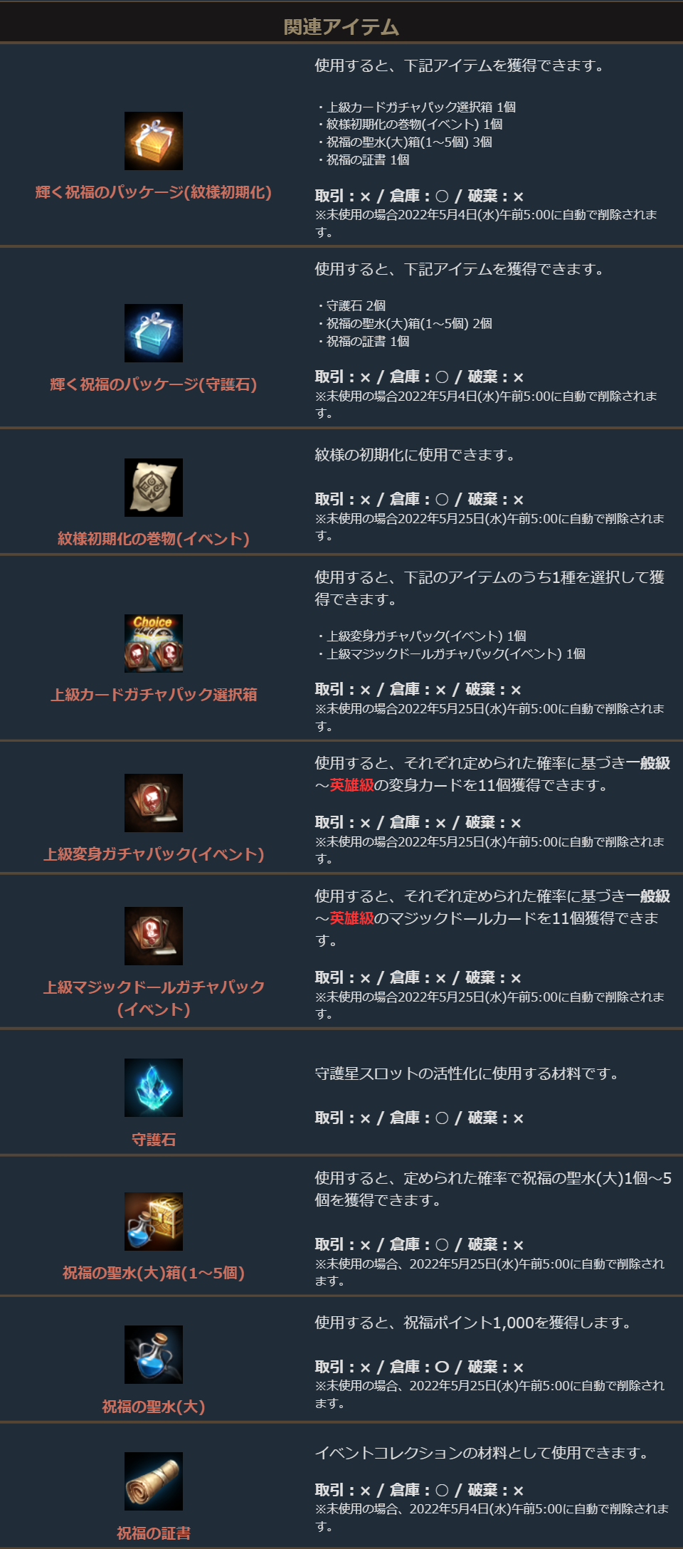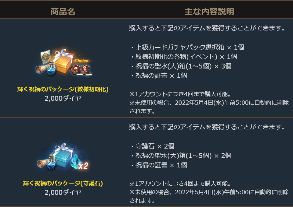 「祝福の聖水(大)箱(1~5個)」をはじめ、「紋様初期化の巻物(イベント)」や「守護石」等が獲得できる2種類のパッケージとなります。