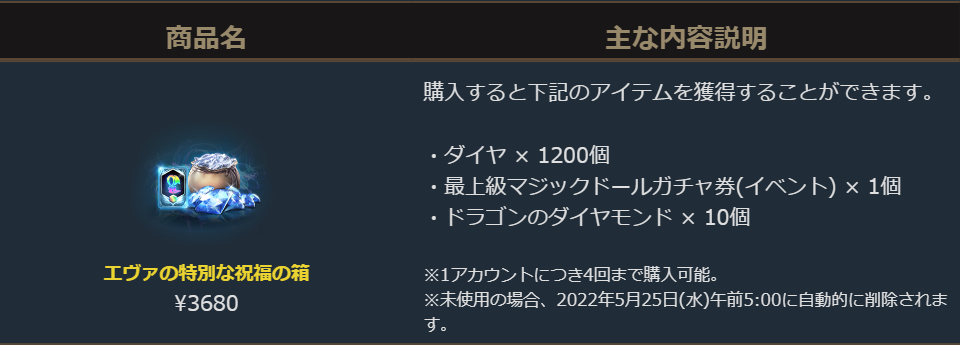 ダイヤに加えて「ドラゴンのダイヤモンド」や「最上級マジックドールガチャ券(イベント)」がセットになったお得な商品です。