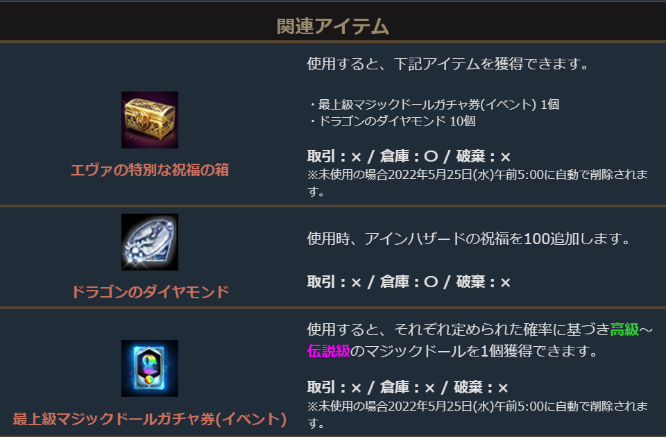 ※一部アイテムは未使用の場合、一定期間が経過すると自動で削除されます。詳しくは各アイテムの詳細をご確認ください。