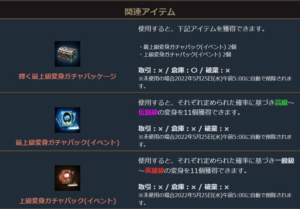 「最上級変身ガチャパック(イベント)」「上級変身ガチャパック(イベント)」が入った、変身カードの獲得に特化したお得なパッケージです。