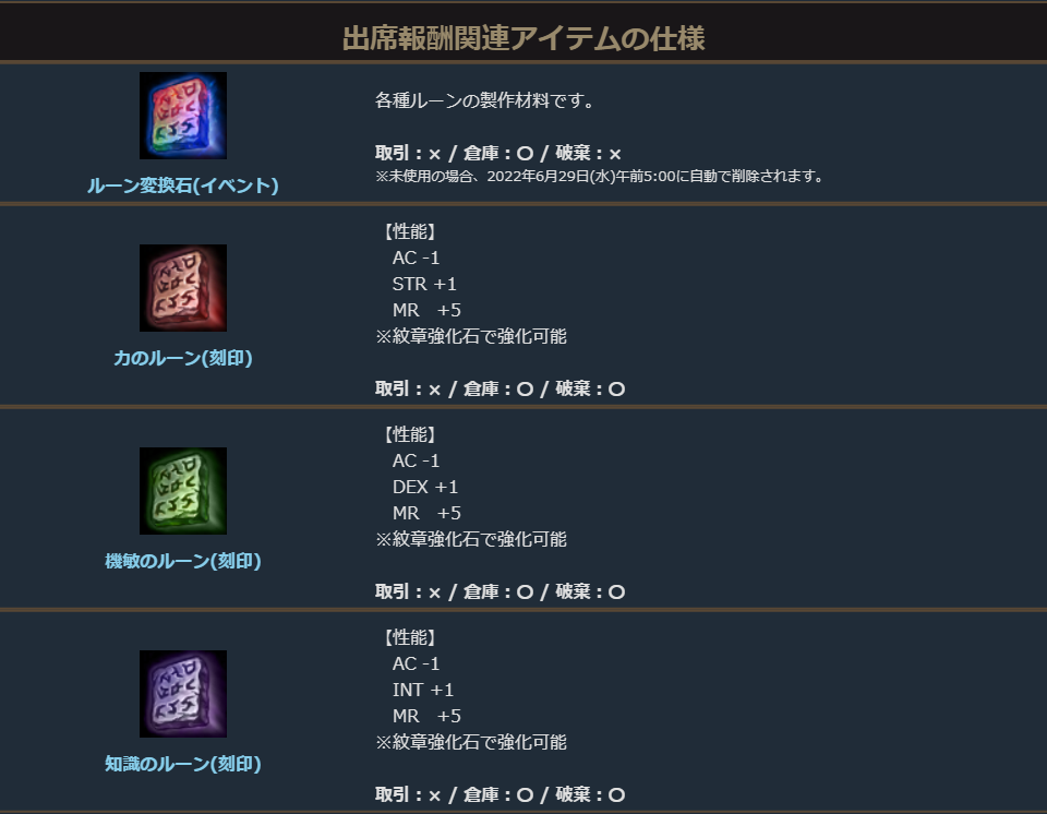 連続出席報酬で獲得できる「ルーン変換石の欠片(出席チェック)」は、期間中1~4個集めることで「ルーン変換石(イベント)」の製作材料として使用できます。