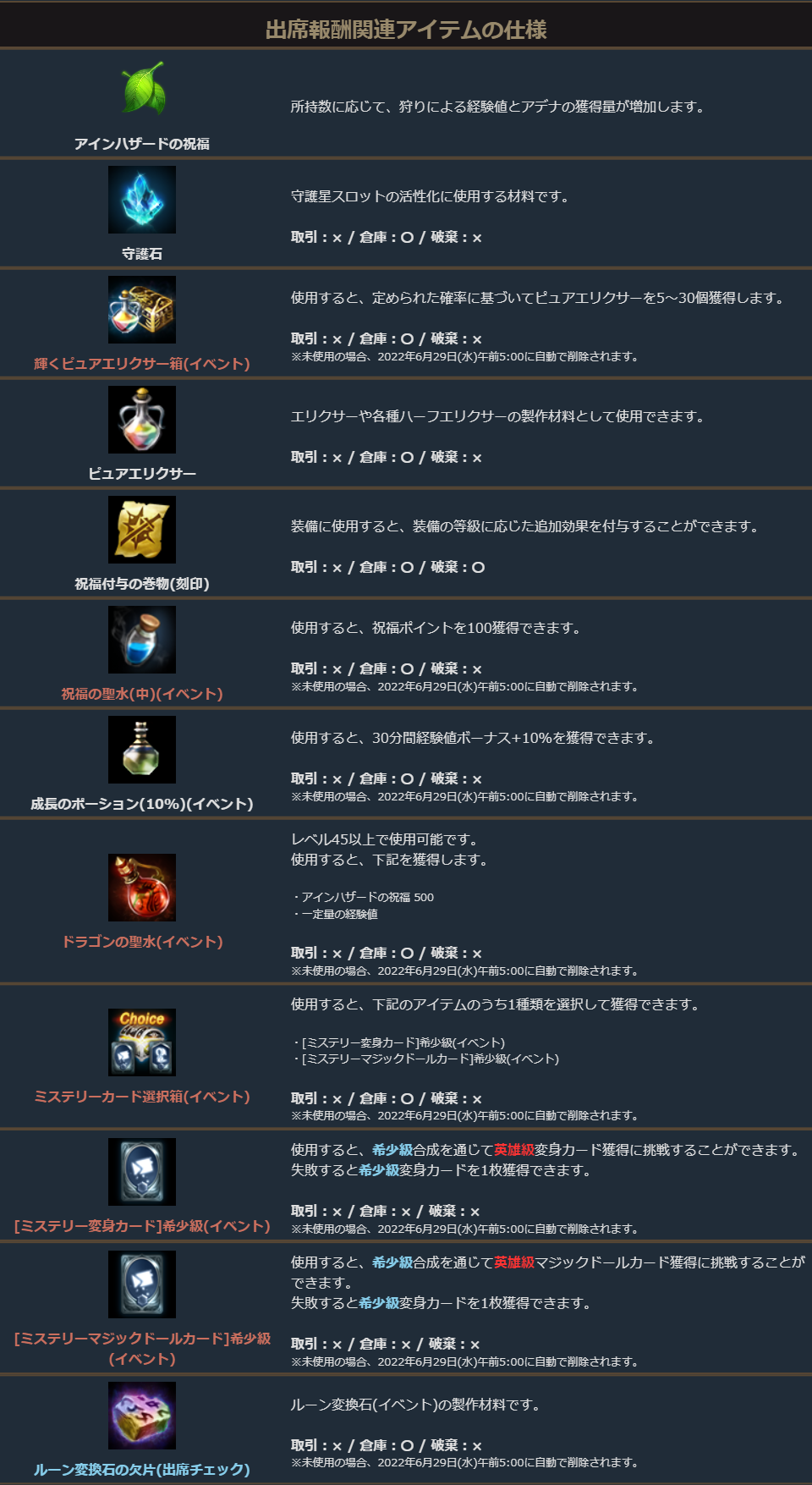 ・出席報酬のアイテム仕様