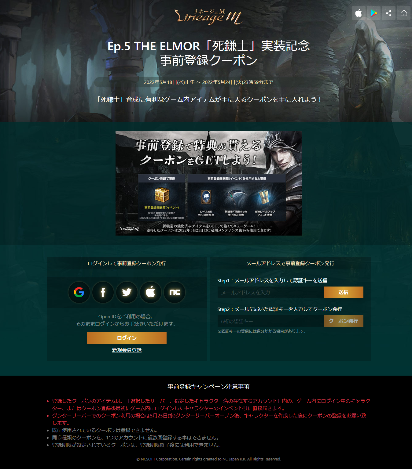 キャンペーン期間中に、「クーポン発行ページ」より発行頂きましたクーポンコードを5月25日以降に「クーポン入力ページ」にて入力する事で、新職業「死鎌士」の育成に有利なアイテムを獲得できます。