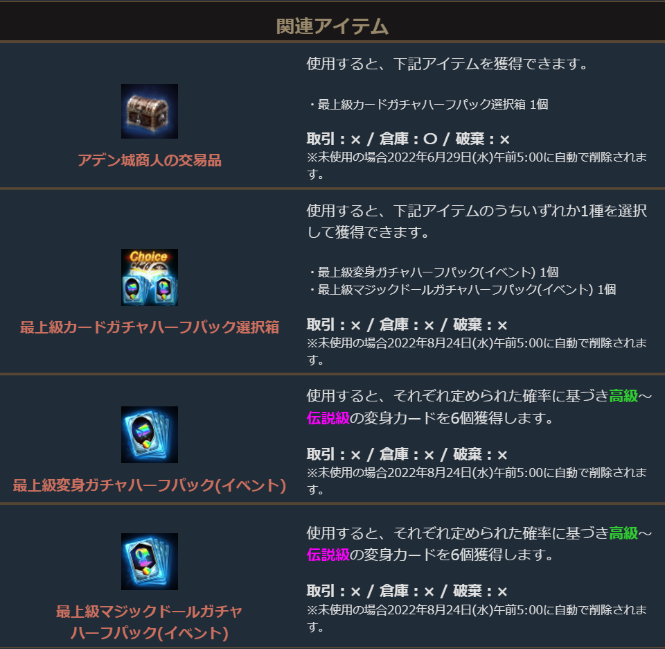 ※一部アイテムは未使用の場合、一定期間が経過すると自動で削除されます。詳しくは各アイテムの詳細をご確認ください。