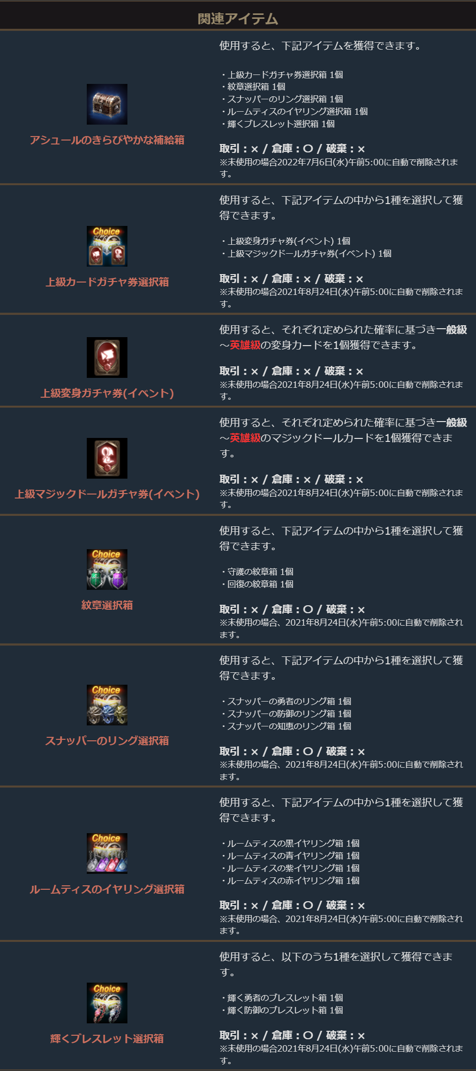 ※一部アイテムは未使用の場合、一定期間が経過すると自動で削除されます。詳しくは各アイテムの詳細をご確認ください。